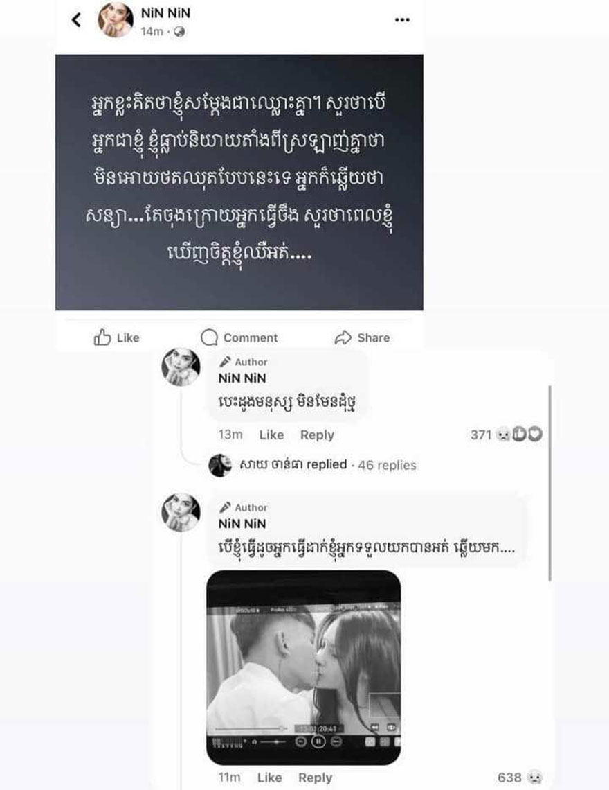 ស្រីស្អាត ឡុង ម៉ានីន ហៅ នីន បានបង្ហោះរូបភាពតារាចម្រៀងលោក ថុល សុភិថិ ថើបមាត់តួស្រីនៅក្នុងឈុតបទចម្រៀង អមជាមួយសំណេរនៅលើគណនីហ្វេសប៊ុករបស់ខ្លួនថា «ធ្លាប់និយាយជាមួយថាម៉េច ឡូវម៉េច ធ្វើអីដឹងខ្លួនឯងហើយ។ ចប់ត្រឹមនឹងចុះ»។