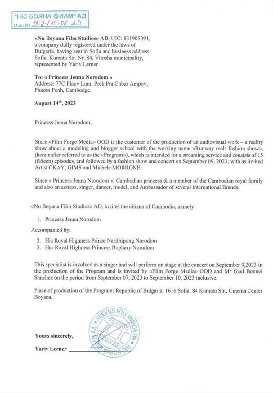 តាមគម្រោង ព្រះនាងនឹងចាកចេញពីប្រទេសកម្ពុជា ទៅកាន់ទឹកដីអឺរ៉ុបនៅថ្ងៃទី៧ ខែកញ្ញា ឆ្នាំ២០២៣ខាងមុខនេះ ដោយនៅក្នុងនោះព្រះនាងនឹងធ្វើទស្សនកិច្ចសិក្សាស្វែងយល់ស្ទីឌីយោថត និងលក្ខណៈបច្ចេកទេសរបស់ក្រុមហ៊ុនភាពយន្ត មុនពេលត្រៀមខ្លួនចូលរួមសម្តែង។