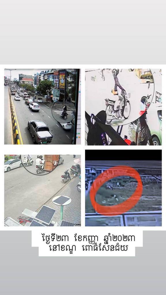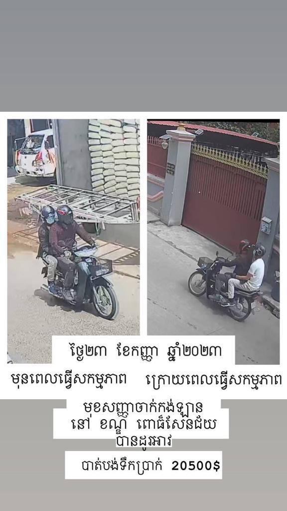 សូមបញ្ជាក់ថា កាលពីថ្ងៃទី២៣ ខែកញ្ញា ឆ្នាំ២០២៣ វេលាម៉ោង០៩ និងព្រឹក មានករណីអំពើលួចមានស្ថានទម្ងន់ទោស (យកដែកគោលកែច្នៃធ្វើសកម្មភាពដោតកង់រថយន្តបណ្តាលឲ្យមុតបែក រួចជនសង្ស័យបើកទ្វាររថយន្តលួចទ្រព្យសម្បត្តិ) ប្រព្រឹត្តនៅចំណុចមុខសិប្បកម្មស្បែកជើង ផ្លូវបេតុង ភូមិថ្មគោល២ សង្កាត់ចោមចៅ២ ខណ្ឌពោធិសែនជ័យ រាជធានីភ្នំពេញ បង្កឡើងដោយជនសង្ស័យ២ នាក់ បានជិះម៉ូតូ១គ្រឿងប្រដាប់ដោយដែកគោលកែច្នៃ (យកដែកគោលមកឆាបឲ្យមានចង្អូរពីក្បាលរហូតដល់ចុង) ដោយជនសង្ស័យឈ្មោះ QING YUI YUN ជាអ្នកបើកម៉ូតូម៉ាកហុងដាសេ១២៥ សេរីឆ្នាំ២០០៧ ពណ៌ខ្មៅ ពាក់ផ្លាកលេខភ្នំពេញ១DK-០៤៥៩ ឌុបឈ្មោះ WEI ZU DAO ចេញពីផ្ទះជួលលេខអិន៣៧អឺ១អឺ២អឺ៣ ផ្លូវបេតុង ភូមិព្រៃទា សង្កាត់ចោមចៅ ៣ ខណ្ឌពោធិសែនជ័យ រាជធានីភ្នំពេញ ដោយមានដាកដែកគោ លកែច្នៃដាក់ជាប់ខ្លួនជាស្រេច គោលបំណងចេញធ្វើសកម្មភាពយកដែកគោលកែច្នៃនោះ ទៅចាក់កង់រថយន្តឲ្យបែក ដើម្បីបើក ទ្វារលួចយកទ្រព្យសម្បត្តិ ។