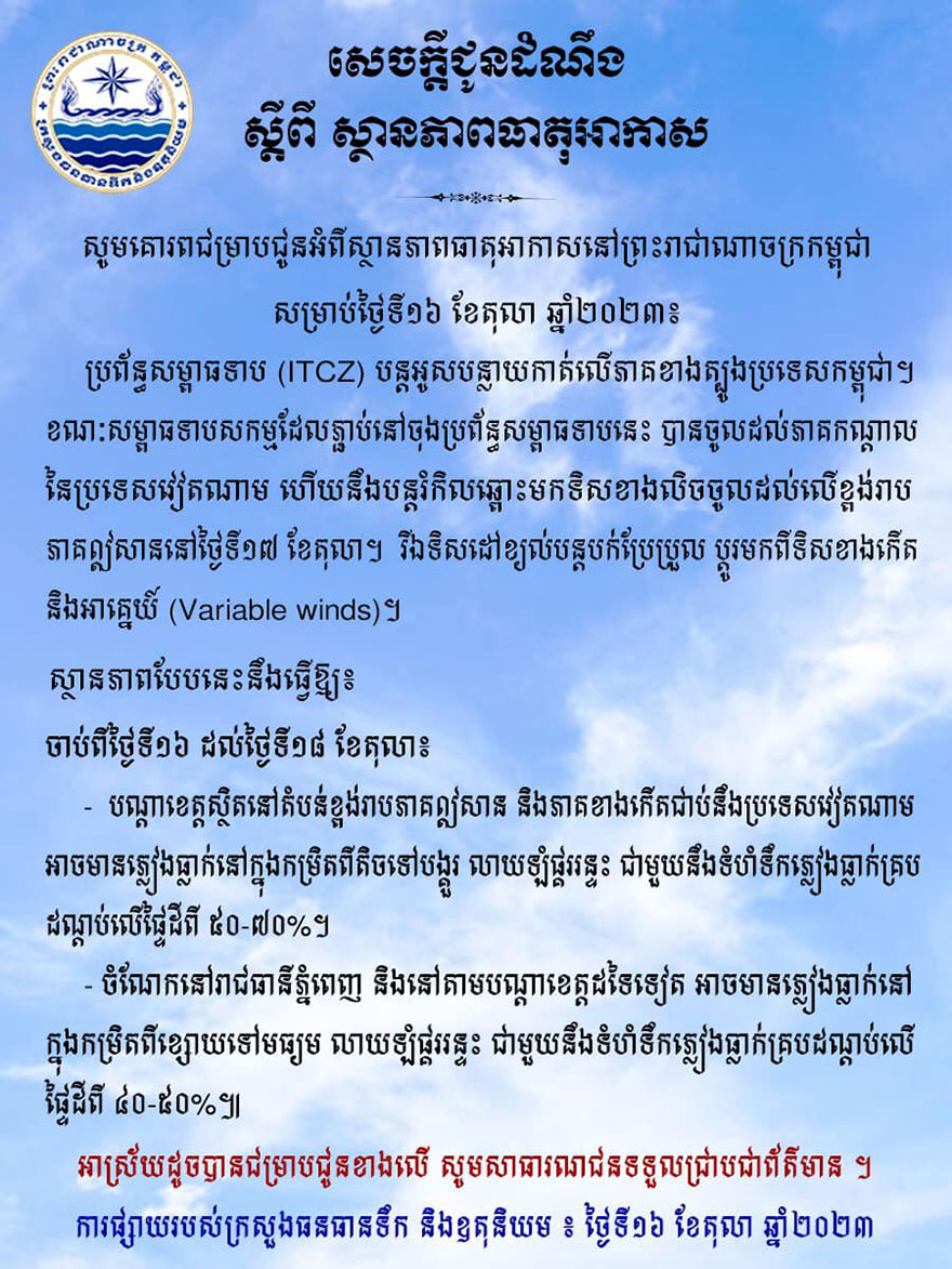យោងតាមសេចក្តីជូនដំណឹងអំពីស្ថានភាពអាកាសធាតុនៅព្រះរាជាណាចក្រកម្ពុជា នៅថ្ងៃទី១៦ ខែតុលា ឆ្នាំ២០២៣នេះ របស់ក្រសួងធនធានទឹក និងឧតុនិយម បានប្រាប់ឱ្យដឹងថា ប្រព័ន្ធសម្ពាធទាប (ITCZ) បន្តអូសបន្លាយកាត់លើភាគខាងត្បូងប្រទេសកម្ពុជា។ ខណៈសម្ពាធទាបសកម្មដែលភ្ជាប់នៅចុងប្រព័ន្ធសម្ពាធទាបនេះ បានចូលដល់ភាគកណ្តាលនៃប្រទេសវៀតណាម ហើយនឹងបន្តរំកិលឆ្ពោះមកទិសខាងលិចចូលដល់លើខ្ពង់រាបភាគឦសាន នៅថ្ងៃទី១៧ ខែតុលាស្អែកនេះ។ រីឯទិសដៅខ្យល់បន្តបក់ប្រែប្រួលប្តូរមកពីទិសខាងកើត និងអាគ្នេយ៍ (Variable winds) វិញ។