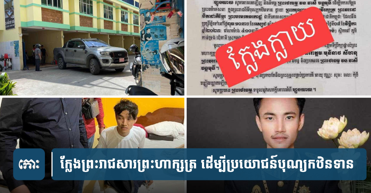 រាជធានីភ្នំពេញ ៖ ជនដែលក្លែងព្រះរាជសារព្រះហាក្សត្រនៃព្រះរាជាណាចក្រកម្ពុជា ត្រូវបានកម្លាំងនគរបាលនៃអគ្គស្នងការនគរបាលជាតិស្រាវជ្រាវឃាត់ខ្លួនបាន កាលពីថ្ងៃទី២៩ ខែតុលា ឆ្នាំ២០២៣ ស្ថិតនៅផ្ទះសំណាក់មួយកន្លែងនៅមុខមន្ទីរពេទ្យមិត្តភាពកម្ពុជាចិន ហៅមន្ទីរពេទ្យលោកសង្ឃ ក្នុងភូមិបុរីកម្មករសង្កាត់ទឹកថ្លា ខណ្ឌសែនសុខ រាជធានីភ្នំពេញ។