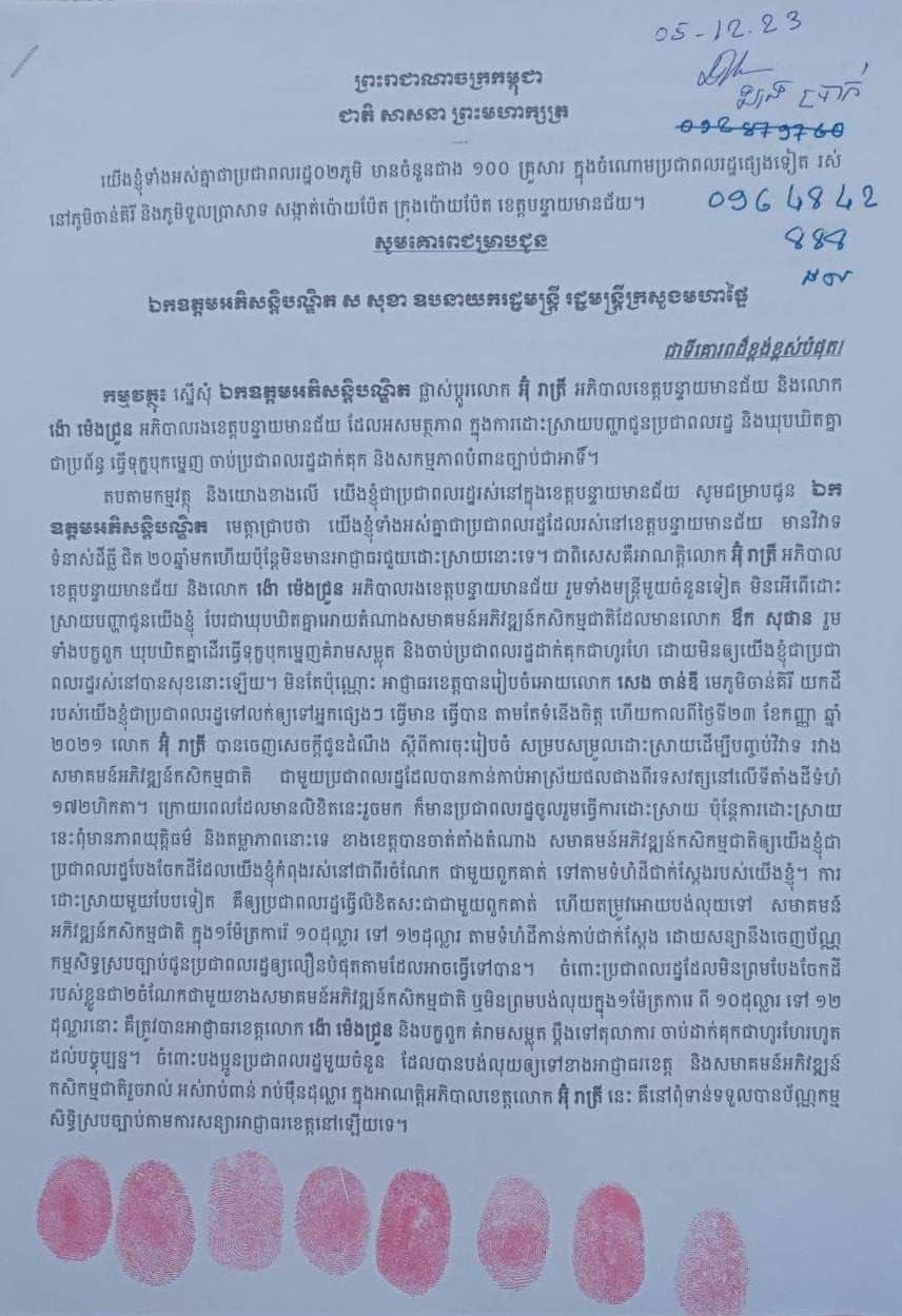 ខេត្តបន្ទាយមានជ័យ ៖ ប្រជាពលរដ្ឋ២ភូមិមានចំនួន១០០គ្រួសារ នាំគ្នាផ្តិតមេដៃស្នើសុំឯកឧត្តមអភិសន្តិបណ្ឌិត ស សុខា ផ្លាស់ប្តូរលោក អ៊ុំ រាត្រី និងលោក ង៉ោ ម៉េងជ្រួន រឿងដោះស្រាយវិវាទដីធ្លី ក្រោយទទួលភាពអយុត្តិធម៌នៅក្នុងសង្កាត់ប៉ោយប៉ែត ក្រុងប៉ោយប៉ែត ។
