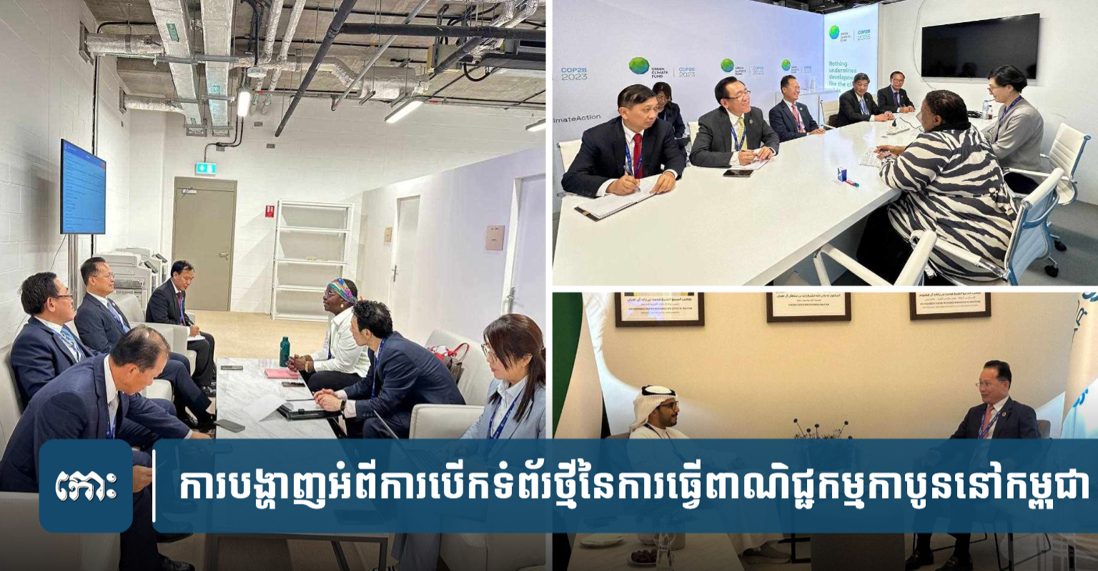 រាជធានីភ្នំពេញ ៖ ក្នុងជំនួបទ្វេរភាគី ជាមួយតំណាងក្រុមហ៊ុនសិង្ហបុរី រដ្ឋមន្ត្រីក្រសួងបរិស្ថានកម្ពុជាបានបង្ហាញអំពីការបើកទំព័រថ្មីនៃការធ្វើពាណិជ្ជកម្មកាបូននៅកម្ពុជាក្រោមមាត្រា៦នៃកិច្ចព្រមព្រៀងទីក្រុងប៉ារីសស្តីពីការប្រែប្រួលអាកាសធាតុ។