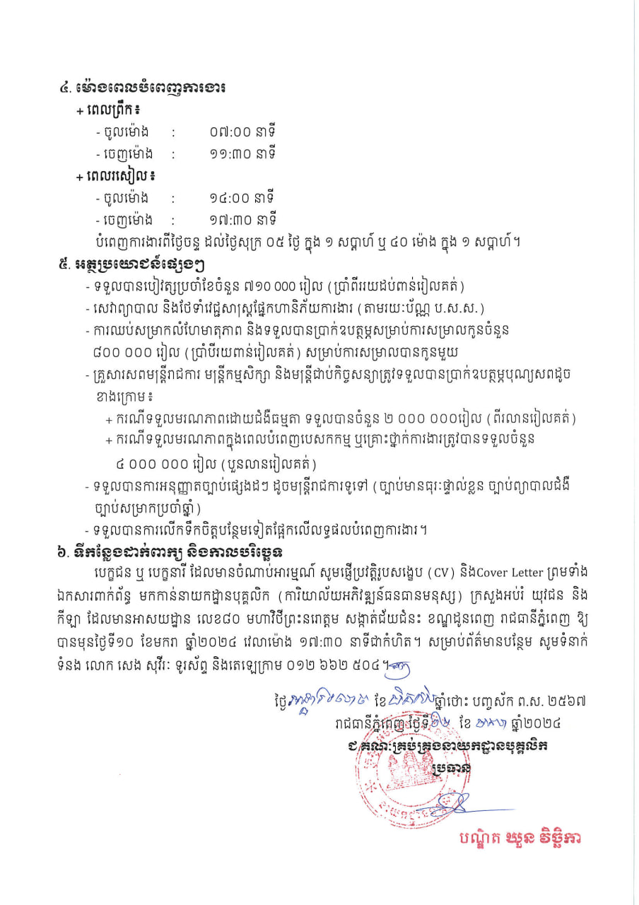 បេក្ខជន ឬបេក្ខនារី ដែលមានចំណាប់អារម្មណ៍ អាចដាក់ប្រវត្តិរូបសង្ខេប ( CV ) និង Cover Letter ព្រមទាំងឯកសារពាក់ព័ន្ធ មកកាន់អាសយដ្ឋានបុគ្គលិក ( ការិយាល័យអភិវឌ្ឍន៍ធនធានមនុស្ស ) ក្រសួងអប់រំ យុវជន និងកីឡា ដែលមានអាសយដ្ឋាន លេខ៨០ មហាវិថីព្រះនរោត្តម សង្កាត់ជ័យជំនះ ខណ្ឌដូនពេញ រាជធានីភ្នំពេញ ឱ្យបានមុនថ្ងៃទី១០ ខែមករា ឆ្នាំ២០២៤ វេលាម៉ោង ៥កន្លះល្ងាច ជាកំហិត។ សម្រាប់ព័ត៌មានបន្ថែម សូមទាក់ទងលោក សេង សុវីរៈ ទូរសព្ទ និងតេឡេក្រាម 012 662 504៕