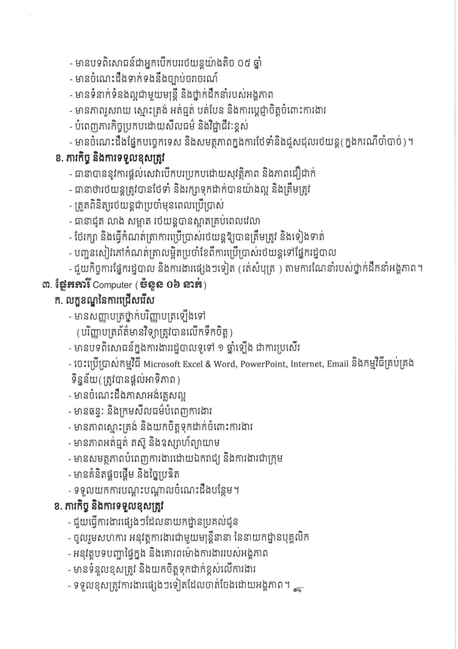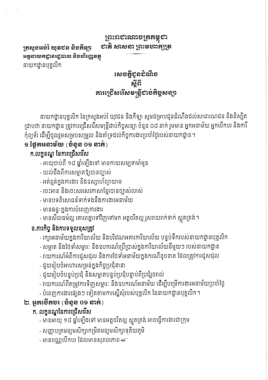 ភ្នំពេញ៖ នាយកដ្ឋានបុគ្គលិក នៃក្រសួងអប់រំ យុវជន និងកីឡា បានប្រកាស ជ្រើសរើសមន្ត្រីជាប់កិច្ចសន្យា ចំនួន ៨នាក់ រួមមាន អ្នកអនាម័យ អ្នកបើកបរ និងការីកុំព្យួទ័រ ដើម្បីចូលរួមសម្របសម្រួល និងគាំទ្រដល់កិច្ចការងារប្រចាំថ្ងៃរបស់នាយកដ្ឋាន។ ក្នុងនោះ ផ្នែកអនាម័យ ម្នាក់ ផ្នែកបើកបររថយន្ត ម្នាក់ និងផ្នែកការីកុំព្យួទ័រ ៦នាក់។