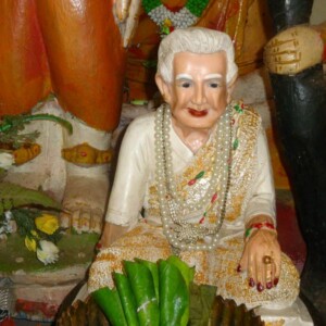 ពីមុនពួកគេបានមករកស៊ីជីកត្បូង ហើយបានយកថ្មកែវពីប្រទេសភូមា មកឆ្លាក់ធ្វើរូបលោកយាយ មានពណ៌សភ្លឺថ្លា ហើយទម្ងន់ប្រហែលជា១០គីឡូក្រាម ដែលសព្វថ្ងៃនេះត្រូវបានព្រះចៅអធិការរក្សាទុកនៅក្នុងព្រះវិហារវត្តភ្នំយ៉ាត ថែមទាំងមិនអនុញ្ញាតឱ្យនរណាម្នាក់ចូលមើល ឬថតរូបនេះឡើយ ។