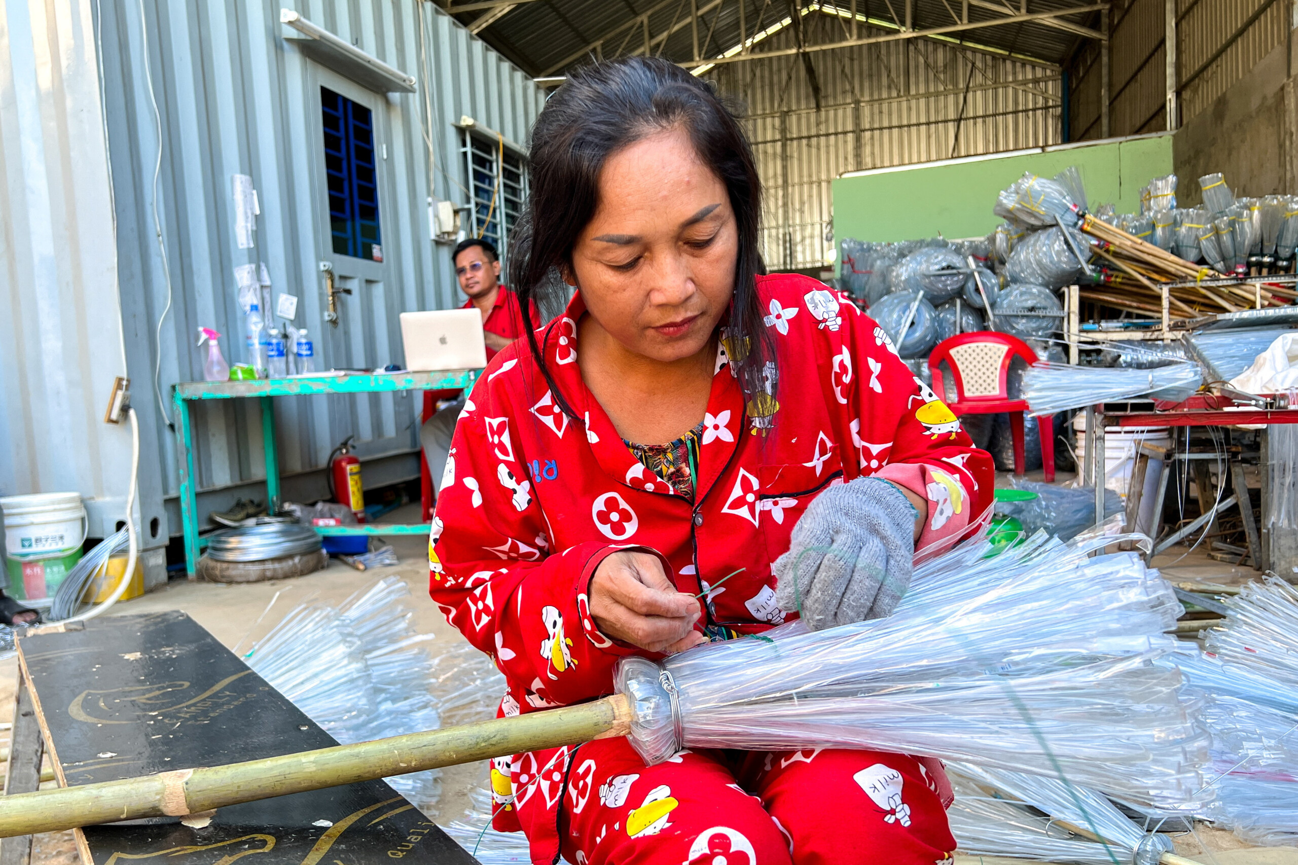 ក្នុងរយៈពេល ១១ខែកន្លងមកនេះ សិប្បកម្មបានកែច្នៃសំណល់ដបប្លាស្ទិក ប្រហែល ៤០តោន ឬប្រហែល ៥,០០០ដបក្នុងមួយថ្ងៃ។ អំបោសច្នៃពីដបទឹកសុទ្ធនេះត្រូវបានដាក់លក់ក្នុងតម្លៃ ១០,០០០រៀល ទៅ ១៥,០០០ក្នុងមួយអំបោស៕ ប្រភព និងរូបភាព៖ REUTERS/Chantha Lach
