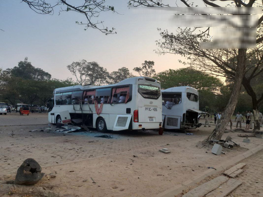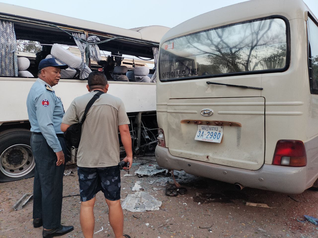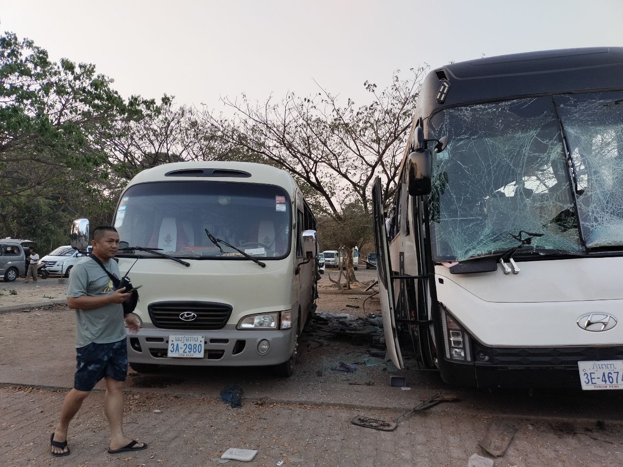 ឡានក្រុងដឹកភ្ញៀវទេសចរចតនៅចំណតមុខអង្គរសុខៗ ស្រាប់តែផ្ទុះចំនួន៤គ្រឿង