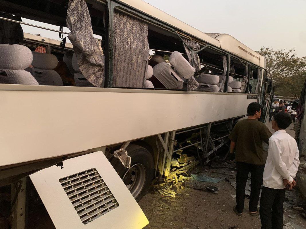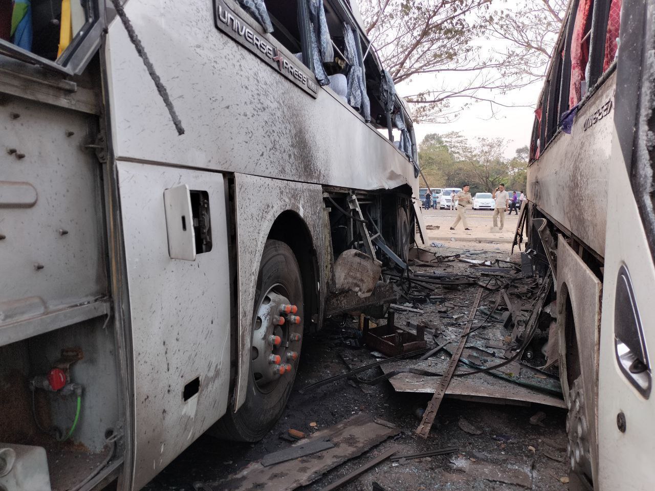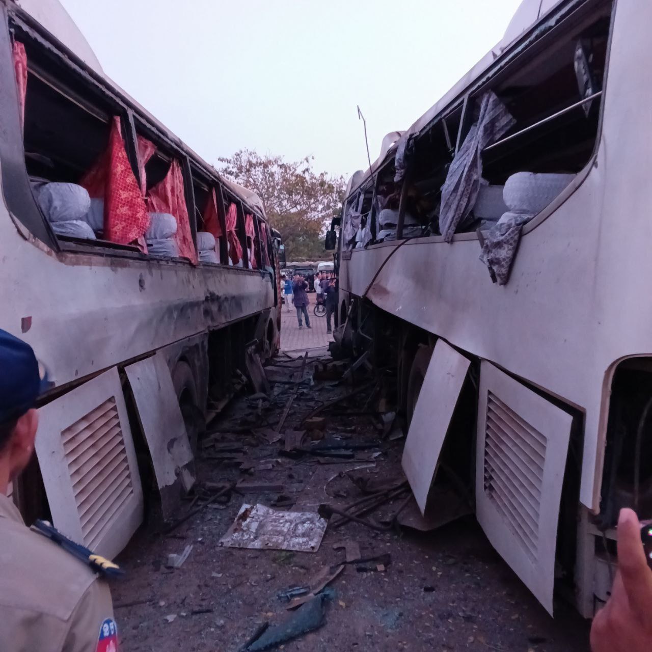 ឡានក្រុងដឹកភ្ញៀវទេសចរចតនៅចំណតមុខអង្គរសុខៗ ស្រាប់តែផ្ទុះចំនួន៤គ្រឿង