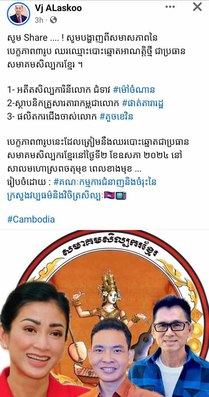 បេក្ខភាព៣រូបនោះ រួមមានអតីតតារាសម្តែងលោកជំទាវ អ្នកឧកញ៉ា ស្រីតូច ចំណាន , លោក គួចខេវិន អ្នករៀបចំកម្មវិធីកម្សាន្តតាមទូរទស្សន៍ និងលោក ផាត់ តារារដ្ឋ ប្រធានគ្រួសារតារាកម្ពុជា ។ បេក្ខភាពទាំង៣រូបខាងលើនេះនឹងត្រូវអង្គបោះឆ្នោតដែលជាអ្នកសិល្បៈជាច្រើនរូប បោះឆ្នោតជ្រើសរើសជាប្រធានសមាគមសម្រាប់អាណត្តិថ្មី ដែលគ្រោងធ្វើឡើងនៅថ្ងៃទី២ ខែឧសភា ឆ្នាំ២០២៣ ខាងមុខនេះ នៅសាលសន្និសីទចតុមុខ ។
