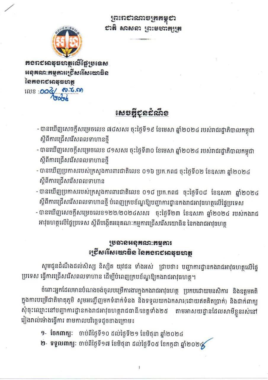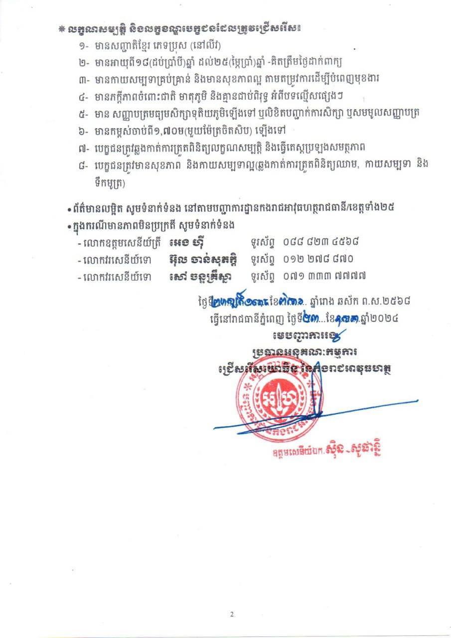 ចំពោះអ្នកដែលមានបំណងចង់ចូលបម្រើការងារក្នុងកងរាជអាវុធហត្ថ ប្រកបដោយមនសិការ និងឧត្តមគតិ ក្នុងការបម្រើជាតិមាតុភូមិ អាចអញ្ជើញទំនាក់ទំនង និងទទួលយកឯកសារ(ដោយឥតគិតប្រាក់) និងដាក់ពាក្យ សុំចុះឈ្មោះនៅបញ្ជាការដ្ឋានកងរាជអាវុធហត្ថរាជធានី/ខេត្តទាំង ២៥ តាមអាសយដ្ឋានដែលសាមីខ្លួនរស់នៅ រៀងរាល់ម៉ោងធ្វើការ តាមកាលបរិច្ឆេទដូចខាងក្រោម៖