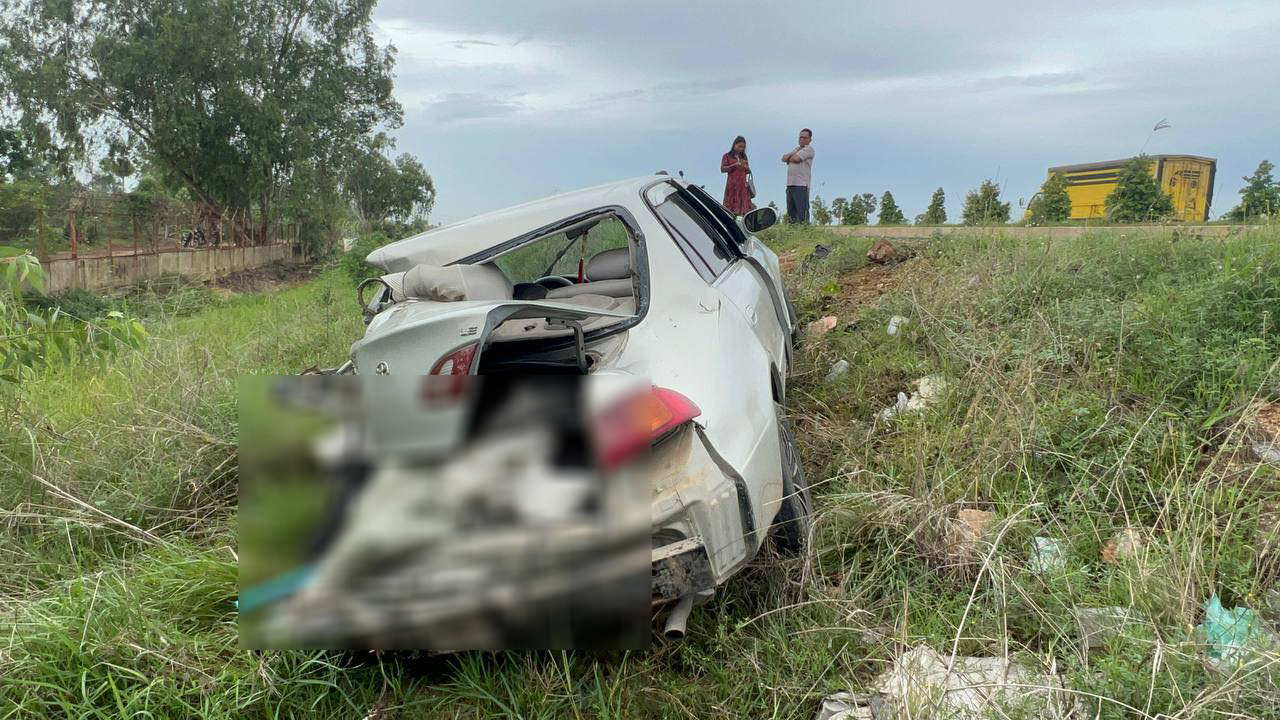 ឡានកូរ៉ូឡាសុីញ៉ូអែបខាង ដើម្បីបត់ជើងតូច ស្រាប់តែកុងតឺន័របុ.កពីក្រោយធ្លា.ក់ផ្លូវខ្ទេ.ច