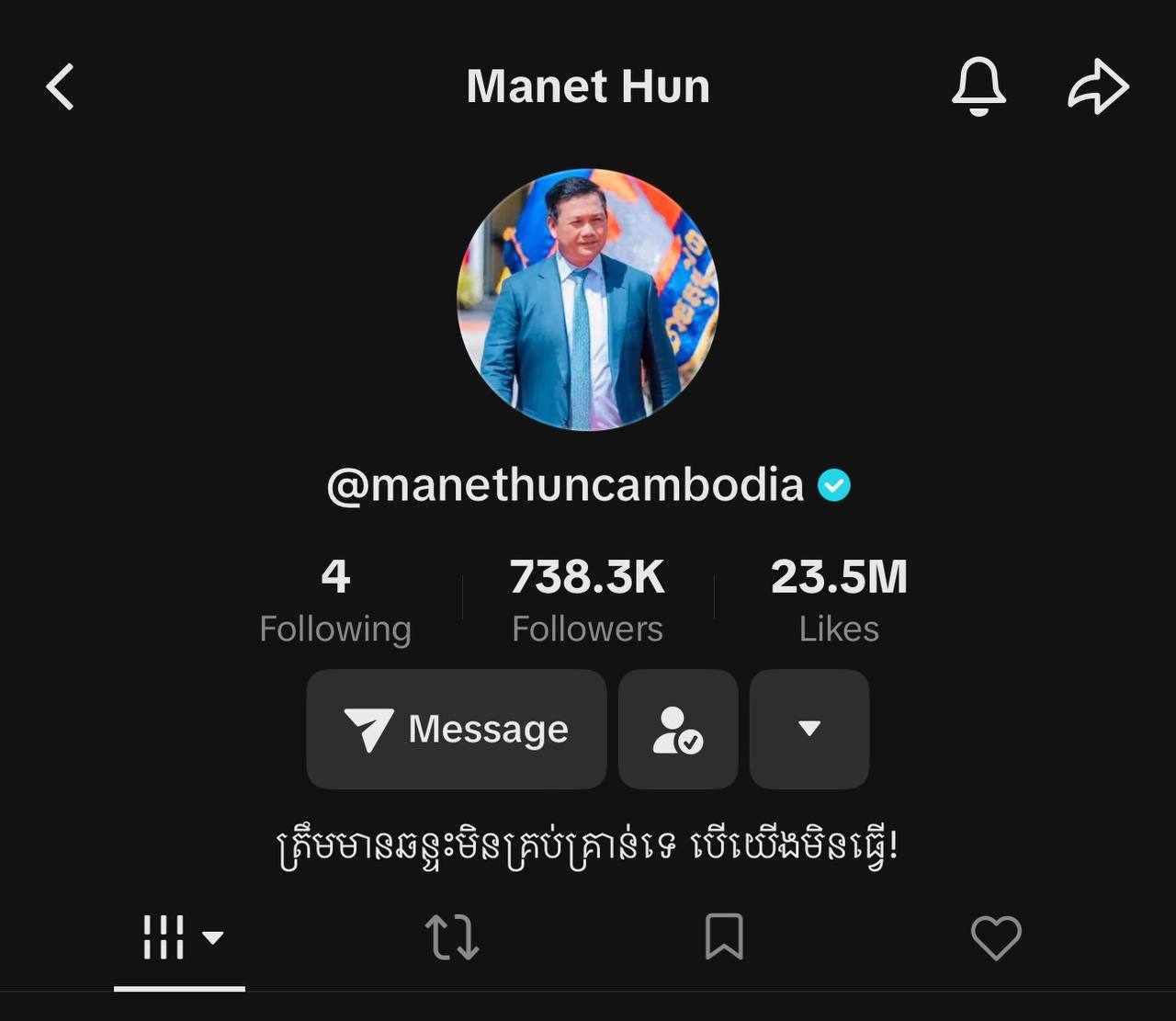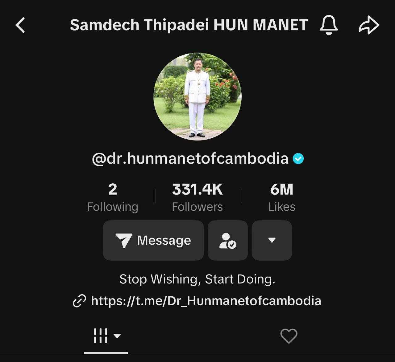 រាជធានីភ្នំពេញ ៖ សម្តេចធិបតី ហ៊ុន ម៉ាណែត នាយករដ្ឋមន្ត្រីកម្ពុជា បានប្រកាសជាផ្លូវការណ៍លើគណនីតិកតុកចំនួនពីរ ។ យោងតាមបណ្តាញសង្គមហ្វេសប៊ុកសម្តេចធិបតី នៅថ្ងៃទី២៥ កក្កដា បានឲ្យដឹងថា សូមជម្រាបជូនដល់បងប្អូន អ៊ំ ពូ មីង តា យាយ ទាំងអស់ មេត្តាជ្រាបអំពីគណនីតិកតុក (Tik Tok) ផ្លូវការណ៍ផ្ទាល់ខ្លួនរបស់ខ្ញុំ ដែលមានឈ្មោះថា Manet Hun ដែលប្រើប្រាស់ សម្រាប់ទំនាក់ទំនងបន្ថែមជាមួយបងប្អូនទាំងអស់ក្នុងបណ្តាញសង្គមកំពុងមានប្រជាប្រិយភាពនេះ។