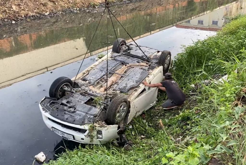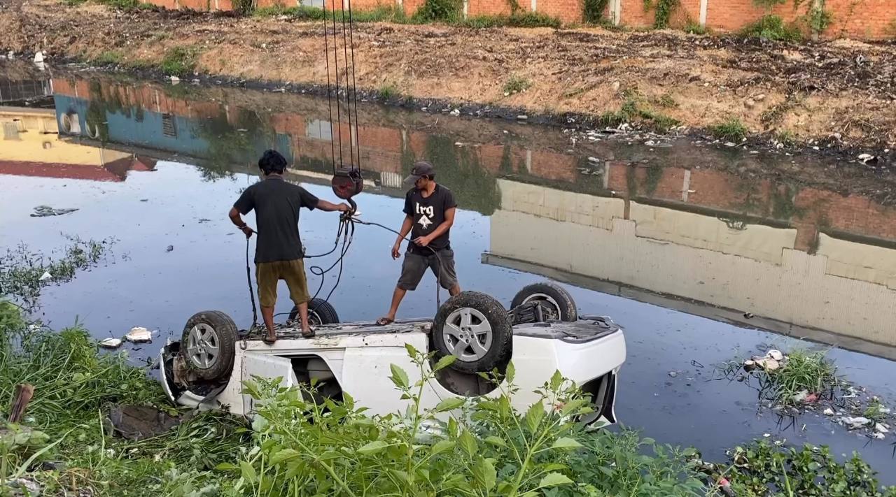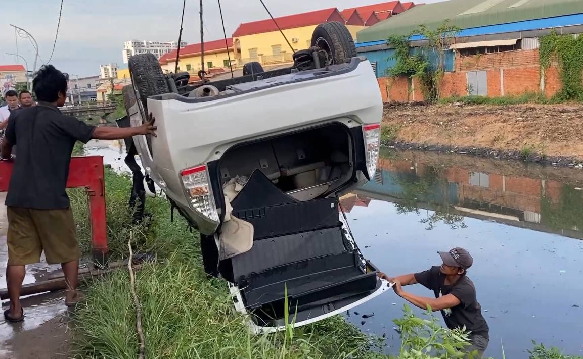 រាជធានីភ្នំពេញ ៖ ស្ត្រីវ័យជាង៣០ឆ្នាំ បើកបររវល់តែងោកចុចទូរស័ព្ទរេចង្កូតធ្លាក់ប្រឡាយលូ ក្រឡា.ប់ផ្ងារជើង តែមិនមានរងរបួសនោះឡើយ ។