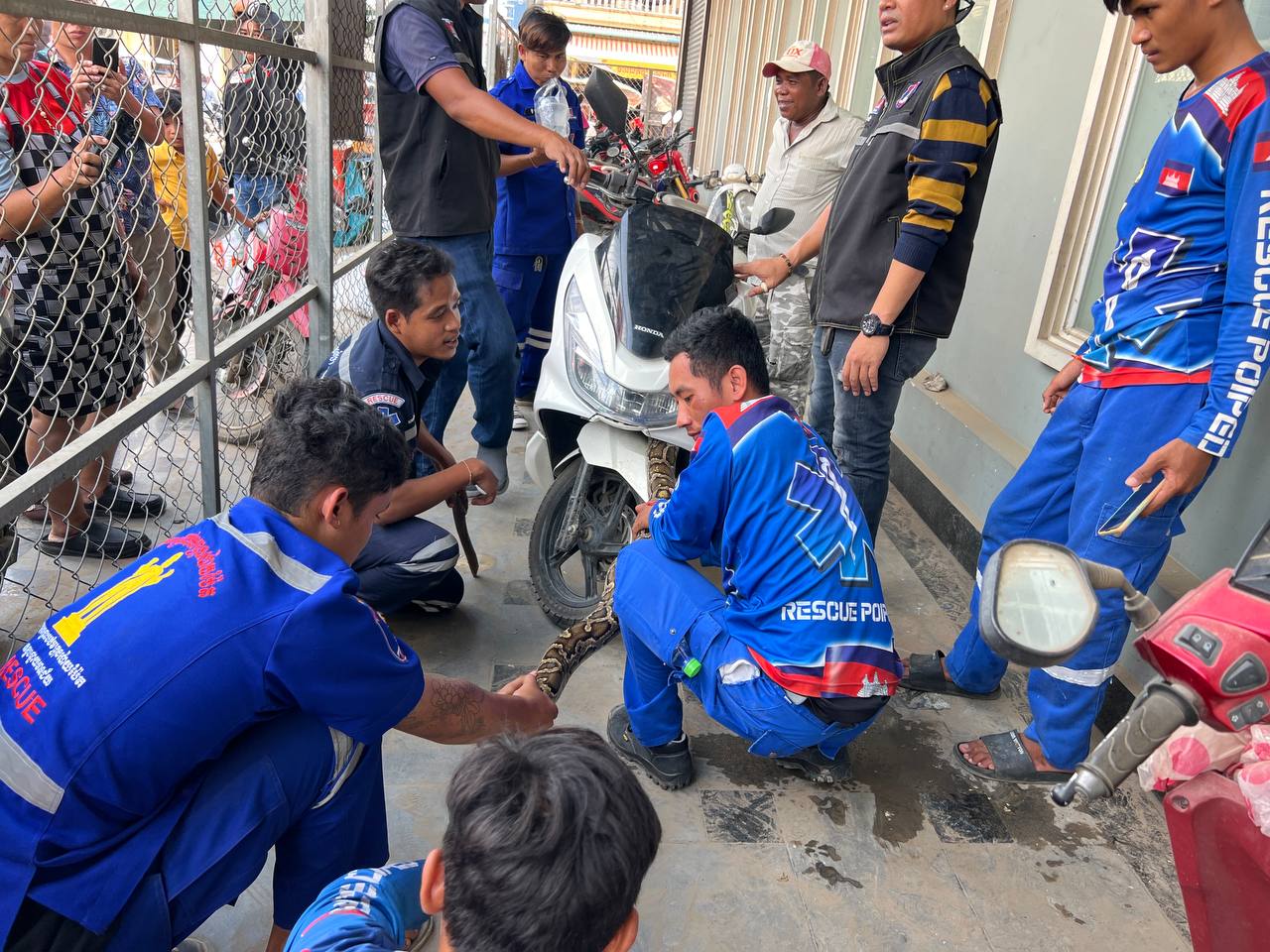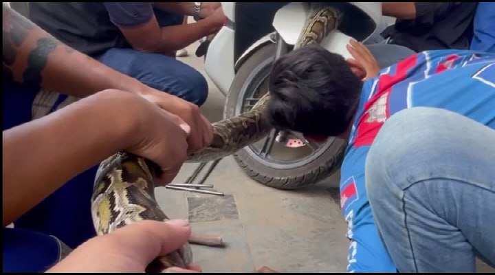 ប្រជាពលរដ្ឋបានឱ្យដឹងថា នៅពេលម្ចាស់ម៉ូតូម៉ាក PCX បម្រុងយកម៉ូតូជិះទៅផ្សារ ស្រាប់តែប្រទះឃើញពស់ថ្លាន់១ក្បាលកំពុងសំងំនៅក្នុងម៉ូតូធ្វើភ្នែកភ្លឹសៗដាក់ ហើយម្ចាស់ម៉ូតូក៏បានហៅជាង និងក្រុមអន្តរាគមន៍ជួយសង្គ្រោះសត្វពស់នោះ ដោយជាងម៉ូតូមកដោះអាវម៉ូតូចេញ ទើបទាញយកចេញបាន ដែលជាពស់ថ្លាន់១ក្បាលជិត១០គីឡូក្រាម។