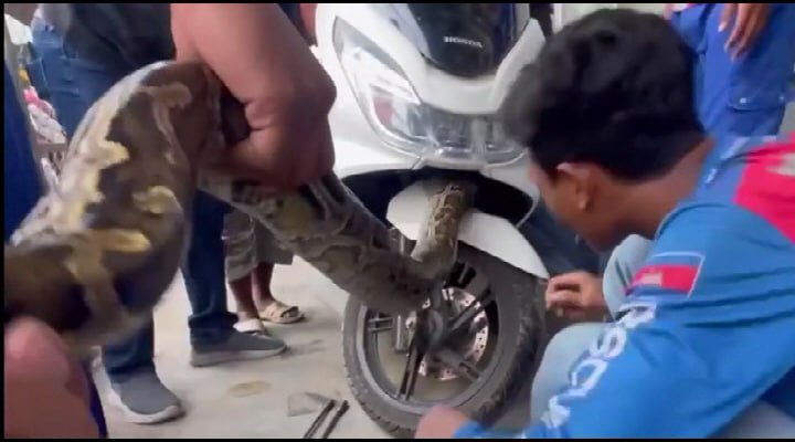 ខេត្តបន្ទាយមានជ័យ ៖ សត្វពស់ថ្លាន់១ក្បាល មានទម្ងន់ជិត១០គីឡូក្រាមវារចូលក្នុងម៉ូតូមួយគ្រឿងម៉ាក PCX មិនព្រមចេញ លុះម្ចាស់ម៉ូតូហៅជាង និងក្រុមអន្តរាគមន៍ ទើបយកចេញបាន។