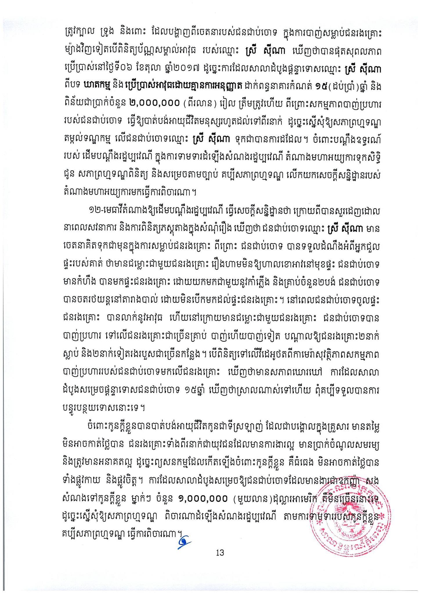 សាលាឧទ្ធរណ៍ភ្នំពេញ សម្រេចតម្កល់ការផ្ដន្ទាទោសអតីតឧកញ៉ា ស្រី ស៊ីណា នៅដដែល