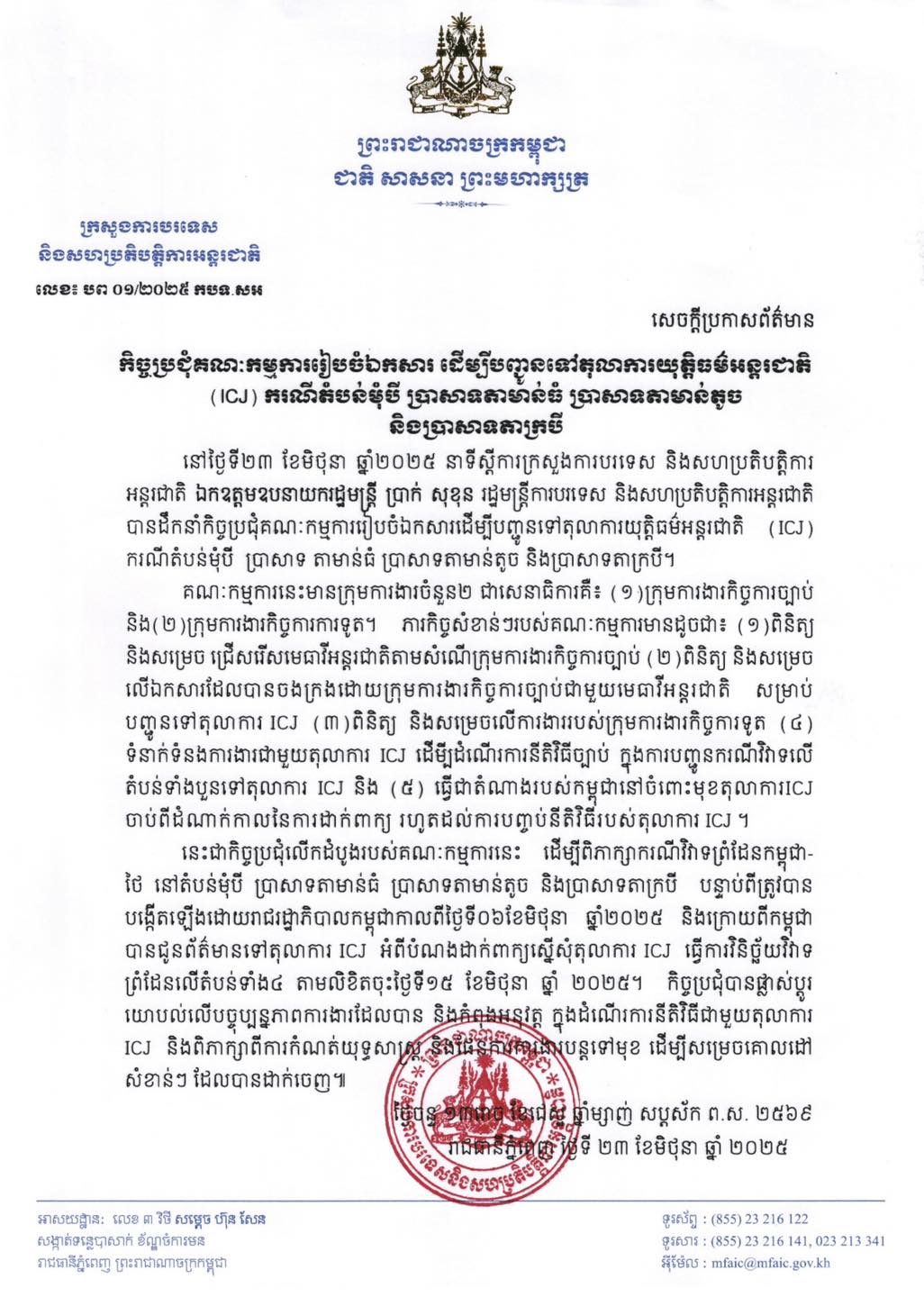 រាជធានីភ្នំពេញ ៖ ក្រសួងការបរទេស និងសហប្រតិបត្តិការអន្តរជាតិ បានចេញសេចក្តីប្រកាសព័ត៌មាន អំពីលទ្ធផលកិច្ចប្រជុំគណៈកម្មការរៀបចំឯកសារ ដើម្បីបញ្ជូនទៅតុលាការយុត្តិធម៌អន្តរជាតិ ICJ ករណីតំបន់មុំបី ប្រាសាទតាមាន់ធំ ប្រាសាទតាមាន់តូច និងប្រាសាទតាក្របី ។