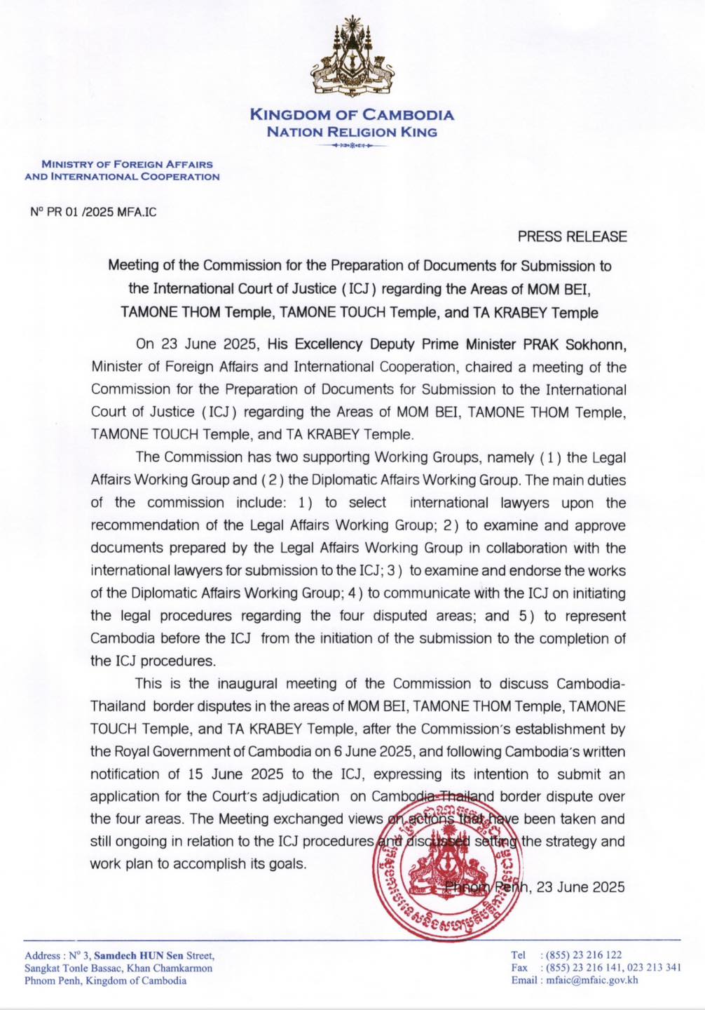 នៅថ្ងៃទី២៣ ខែមិថុនា ឆ្នាំ២០២៥ នាទីស្តីការក្រសួងការបរទេស និងសហប្រតិបត្តិការ អន្តរជាតិ ឯកឧត្តមឧបនាយករដ្ឋមន្ត្រី ប្រាក់ សុខុន រដ្ឋមន្ត្រីការបរទេស និងសហប្រតិបត្តិការអន្តរជាតិ បានដឹកនាំកិច្ចប្រជុំគណៈកម្មការរៀបចំឯកសារ ដើម្បីបញ្ជូនទៅតុលាការយុត្តិធម៌អន្តរជាតិ (ICJ) ករណីតំបន់មុំបី ប្រាសាទ តាមាន់ធំ ប្រាសាទតាមាន់តូច និងប្រាសាទតាក្របី ។