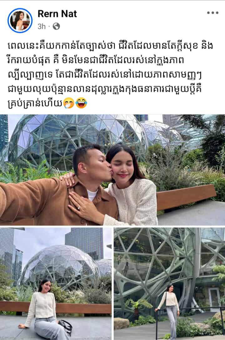 តារារូបនេះបានបង្ហោះសំណេរលើបណ្តាញសង្គមដោយអមជាមួយនឹងរូបភាពផ្អែមល្ហែមជាមួយស្វាមីលើទឹកដីអាមេរិកថា ពេលនេះគឺយកកាន់តែច្បាស់ថា ជីវិតដែលមានតែក្តីសុខ និងរីករាយបំផុត គឺមិនមែនជាជីវិតដែលរស់នៅក្នុងភាពល្បីល្បាញទេ តែជាជីវិតដែលរស់នៅដោយភាពសាមញ្ញៗជាមួយលុយប៉ុន្មានលានដុល្លារក្នុងកុងធនាគារជាមួយប្តីគឺគ្រប់គ្រាន់ហើយ ។