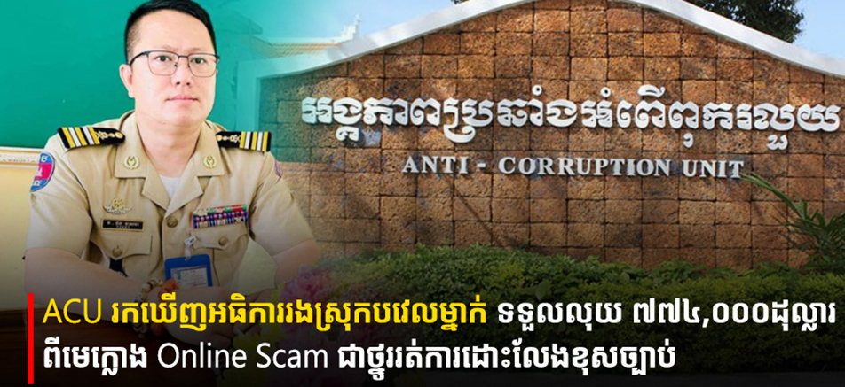 រាជធានីភ្នំពេញ ៖ អង្គភាពប្រឆាំងអំពើពុករលួយ(ACU) បានប្រកាសពីការរកឃើញអធិការរងនគរបាលស្រុកបវេល ខេត្តបាត់ដំបង ១រូប គឺលោក វ៉ន វាសនា ទទួលលុយពីជនជាតិចិននិងថៃចំនួន ៧៧៤ ០០០ដុល្លារ ដែលជាមេខ្លោងក្រុម Online Scams ជាថ្នូរនឹងការដោះលែង បន្ទាប់ពីសមត្ថកិច្ចចាប់ខ្លួន ។ នេះបើតាមរបាយការណ៍របស់អង្គភាពប្រឆាំងអំពើពុករលួយ ដែលបានបង្ហាញនៅថ្ងៃទី២៩ ខែកញ្ញា ឆ្នាំ២០២៥ ក្រោយពីបញ្ចប់កិច្ចប្រជុំក្រុមប្រឹក្សា ។