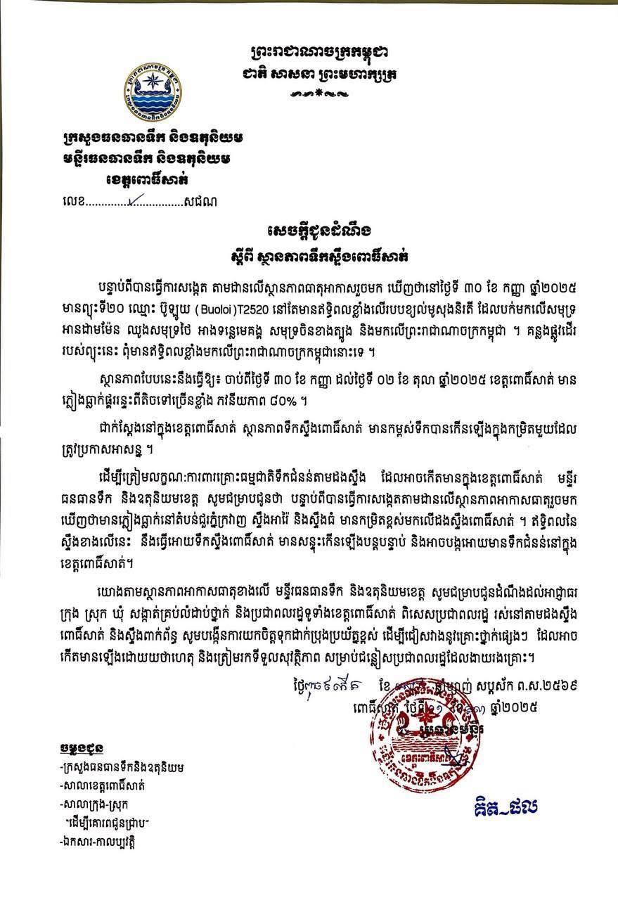 ក្នុងសេចក្តីប្រកាសព័ត៌មាននោះបានឱ្យដឹងថា បន្ទាប់ពីបានធ្វើការសង្កេតតាមដានលើស្ថានភាពធាតុអាកាសរួចមកឃើញថា នៅថ្ងៃទី៣០ ខែកញ្ញា ឆ្នាំ២០២៥ មានព្យុះទី២០ ឈ្មោះ ប៊ូឡូយ (Buoloi) T2520 នៅតែមានឥទ្ធិពលខ្លាំងលើរបបខ្យល់មូសុងនិរតី ដែលបក់មកលើសមុទ្រ អានដាមម៉ែន ឈូងសមុទ្រថៃ អាងទន្លេមេគង្គ សមុទ្រចិនខាងត្បូង និងមកលើព្រះរាជាណាចក្រកម្ពុជា។ គន្លងផ្លូវដើររបស់ព្យុះនេះ ពុំមានឥទ្ធិពលខ្លាំងមកលើព្រះរាជាណាចក្រកម្ពុជានោះទេ។