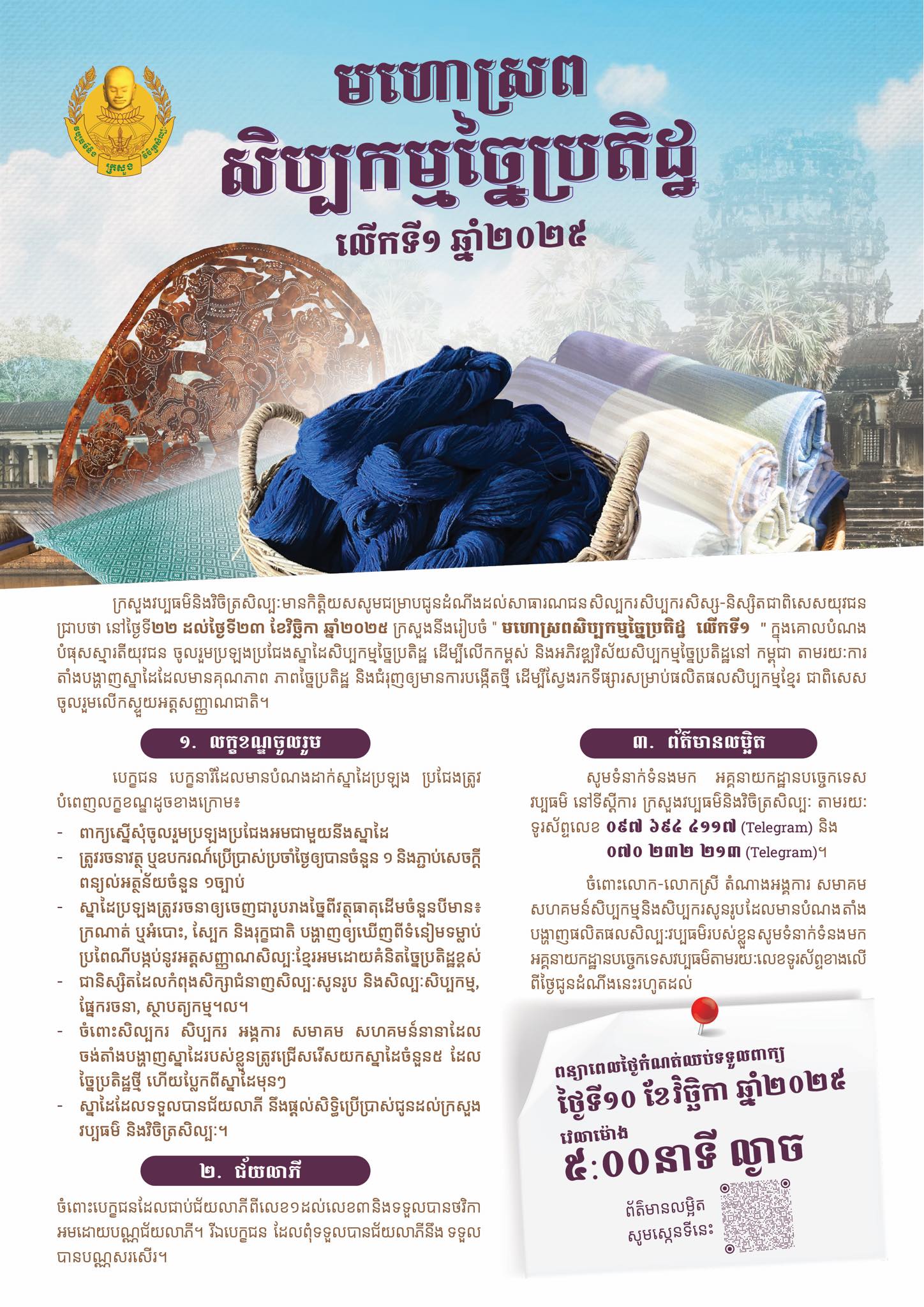 យោងតាមការចុះផ្សាយរបស់ក្រសួងវប្បធម៌ និងវិចិត្រសិល្បៈ នៅថ្ងៃទី០១ ខែតុលានេះ បានឱ្យដឹងថានៅថ្ងៃទី២២ ដល់ថ្ងៃទី២៣ ខែវិច្ឆិកា ឆ្នាំ២០២៥ ក្រសួងនឹងរៀបចំ ” មហោស្រពសិប្បកម្មច្នៃប្រតិដ្ឋ លើកទី១ ” ដែលរៀបចំឡើងក្នុងគោលបំណងបំផុសស្មារតីយុវជន ចូលរួមប្រឡងប្រជែងស្នាដៃសិប្បកម្មច្នៃប្រតិដ្ឋ ដើម្បីលើកកម្ពស់ និងអភិវឌ្ឍវិស័យសិប្បកម្មច្នៃប្រតិដ្ឋនៅកម្ពុជា តាមរយៈការតាំងបង្ហាញស្នាដៃដែលមានគុណភាព ភាពច្នៃប្រតិដ្ឋ និងជំរុញឱ្យមានការបង្កើតថ្មី ដើម្បីស្វែងរកទីផ្សារសម្រាប់ផលិតផលសិប្បកម្មខ្មែរ ជាពិសេសចូលរួមលើកស្ទួយអត្តសញ្ញាណជាតិ។
