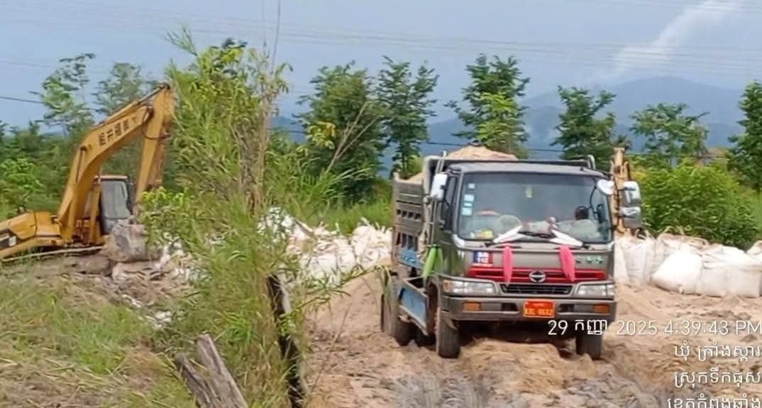 ខេត្តកំពង់ឆ្នាំង ៖ ក្រោយពីសារព័ត៌មានកោះសន្តិភាពបានចេញផ្សាយពីសកម្មភាពបូមខ្សាច់មួយកន្លែង ដែលកំពុងធ្វើសកម្មភាពដាក់គ្រឿងចក្របូមយកខ្សាច់ដឹកជញ្ជូនយកទៅដាក់ទូររថភ្លើង ជាច្រើនម៉ឺនម៉ែត្រគូប រួចមកនៅថ្ងៃទី ២ ខែតុលាឆ្នាំ ២០២៥ នេះ គេសង្កេតឃើញមានមន្ត្រីមន្ទីររ៉ែនិងថាមពល និងមន្ទីរបរិស្ថាន បានចុះទៅផ្អាកសកម្មភាពខុសច្បាប់នោះហើយព្រមទាំងផាកពិន័យជាច្រើនលានរៀលផងដែរ។ គួររំលឹកថា ឈ្មួញបូមខ្សាច់អត់ទាន់មានច្បាប់កំពុងដឹកជញ្ជូនកក្រើ.ក