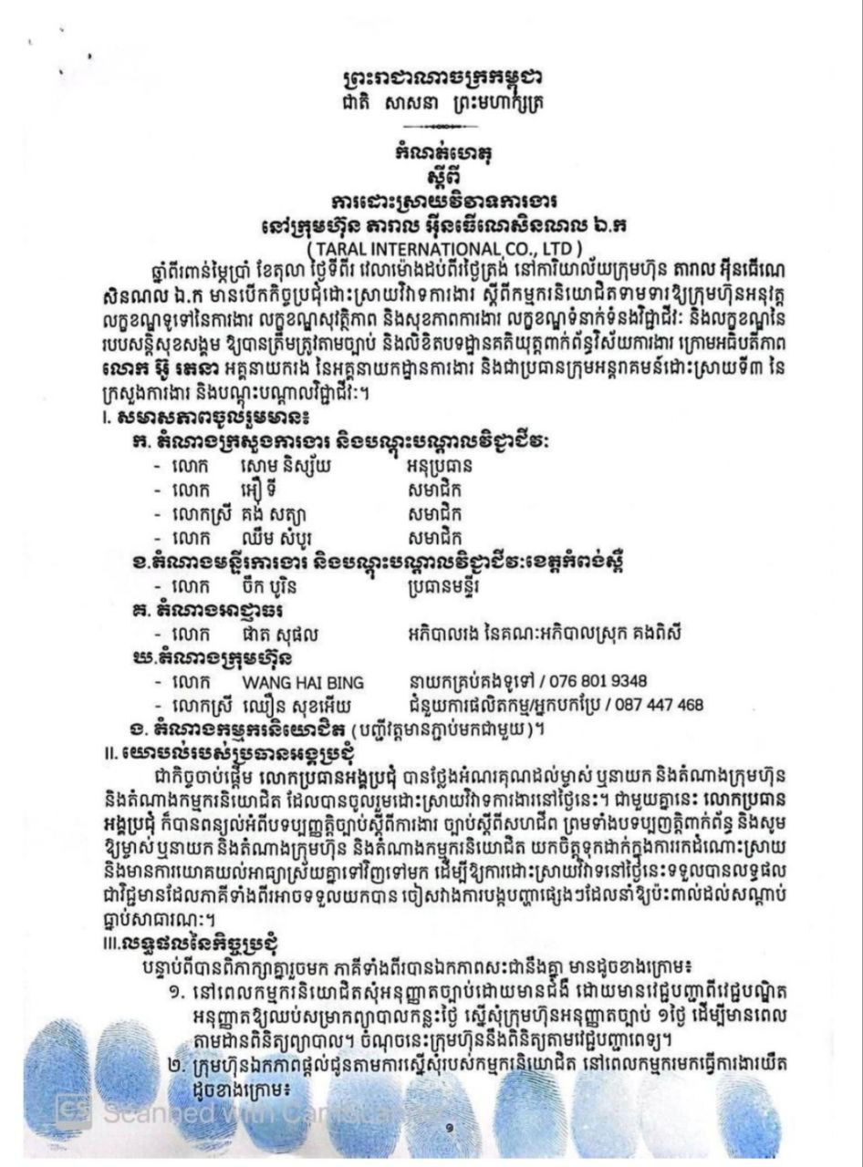 បន្ទាប់ពីផ្ទុះការតវ៉ា ក្រុមការងារនៃក្រសួង និងមន្ទីរការងារនិងបណ្តុះបណ្តាល វិជ្ជាជីវៈ បានបើកកិច្ចប្រជុំដោះស្រាយវិវាទការងារបន្ទាន់ ស្តីពីកម្មករនិយោជិតទាមទារឱ្យក្រុមហ៊ុនអនុវត្តលក្ខខណ្ឌទូទៅនៃការងារ លក្ខខណ្ឌសុវត្ថិភាព និងសុខភាពការងារ លក្ខខណ្ឌទំនាក់ទំនងវិជ្ជាជីវៈ និងលក្ខខណ្ឌនៃរបបសន្តិសុខសង្គម ឱ្យបានត្រឹមត្រូវតាមច្បាប់ និងលិខិតបទដ្ឋានគតិយុត្តិពាក់ព័ន្ធវិស័យការងារ ក្រោមវត្តមាន លោក អ៊ូ រតនា អគ្គនាយករង នៃអគ្គនាយកដ្ឋានការងារ និងជាប្រធានក្រុមអន្តរាគមន៍ដោះស្រាយទី០៣ នៃក្រសួងការងារ និងបណ្តុះបណ្តាលវិជ្ជាជីវៈ។