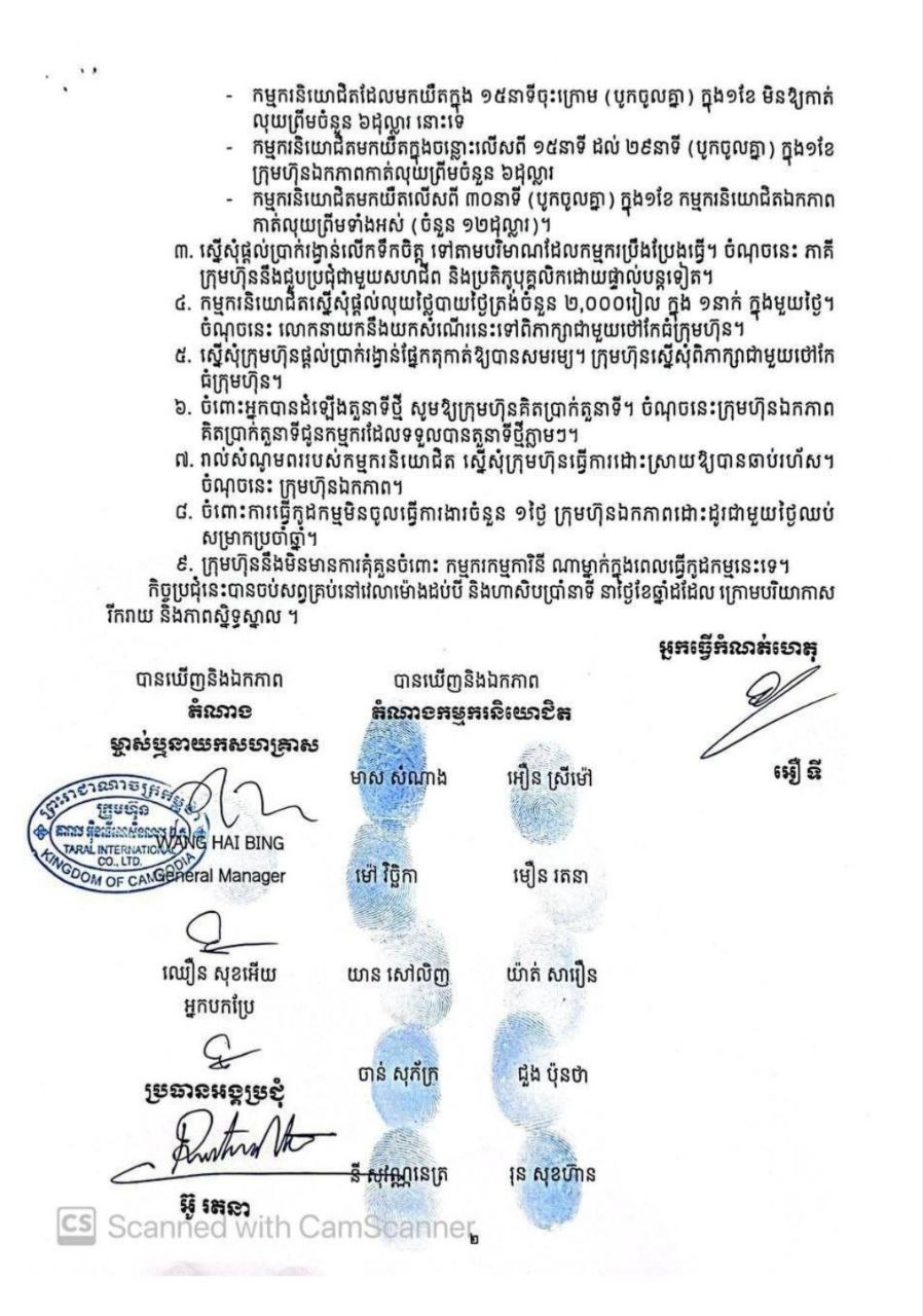 ១១~ រាល់ការបញ្ឈប់កម្មករ សូមបញ្ជាក់ពីហេតុ និងជូនដំណឹងផង។ ចំណុចនេះ ក្រុមហ៊ុនឯកភាព អនុវត្តតាមសំណូមពររបស់កម្មករនិយោជិត។