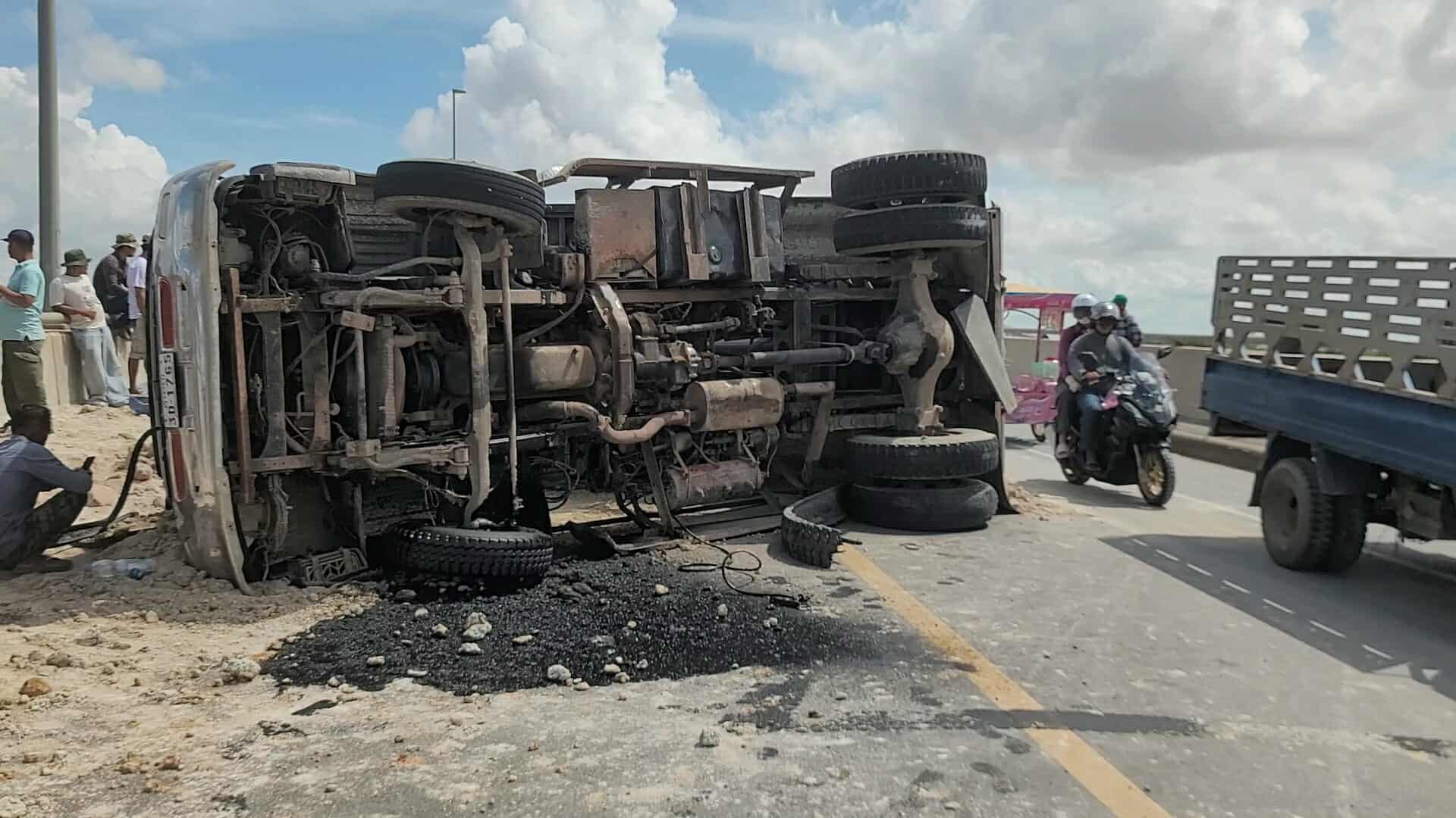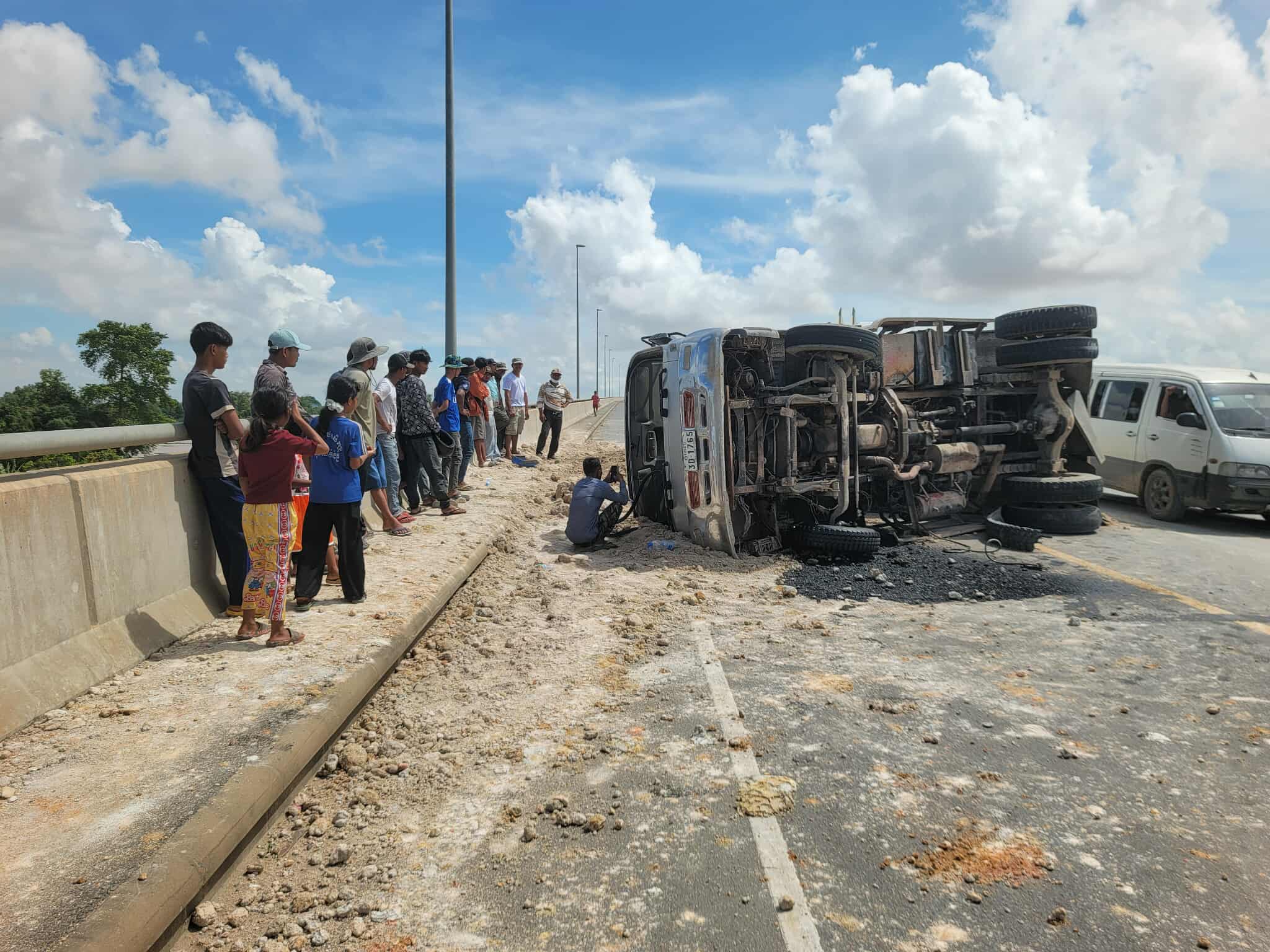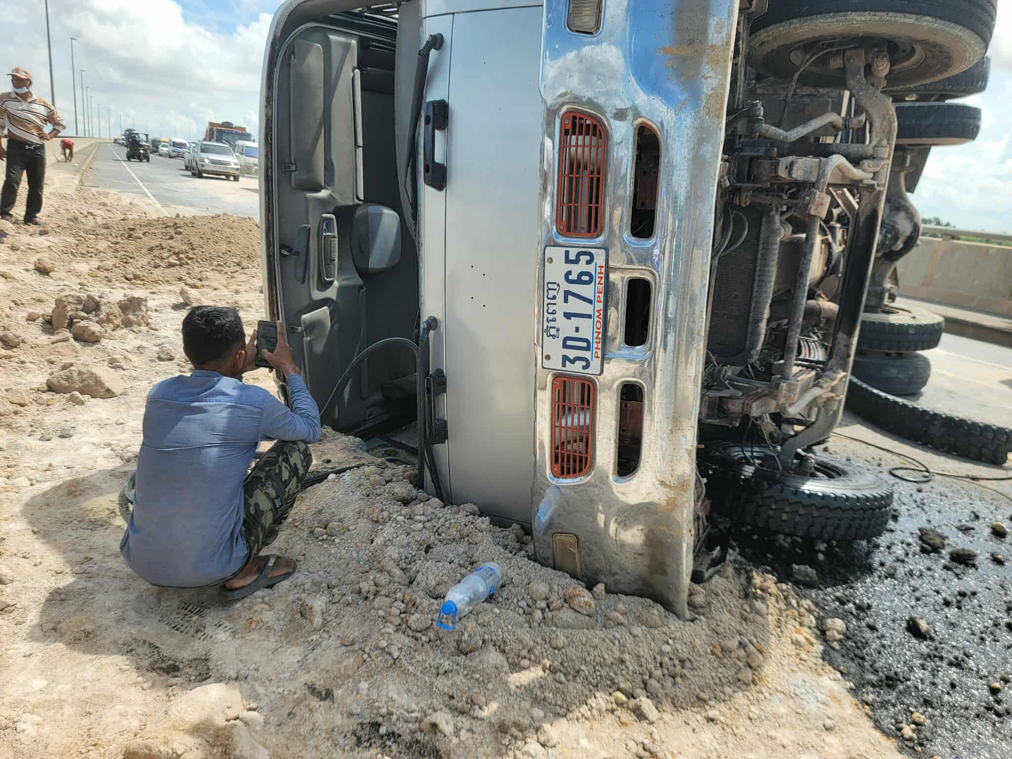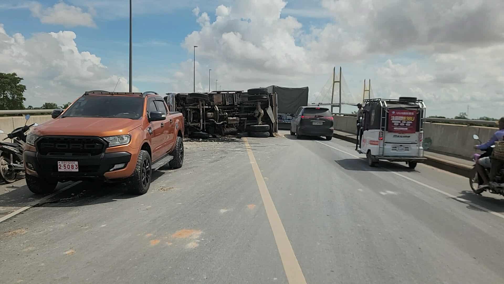 ឡានបែនដឹកដី ដឹកធ្ងន់ពេកផ្ទុះបែកកង់ក្រឡាប់ធ្វើឱ្យស្ទះចរាចរណ៍លើស្ពានរាប់ម៉ោង