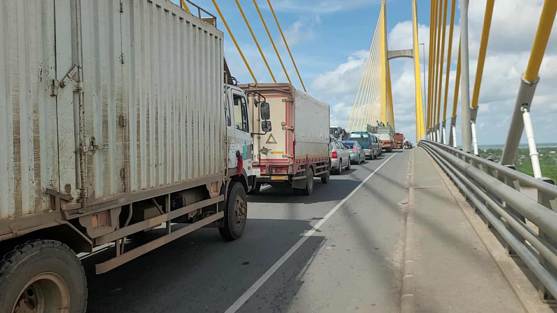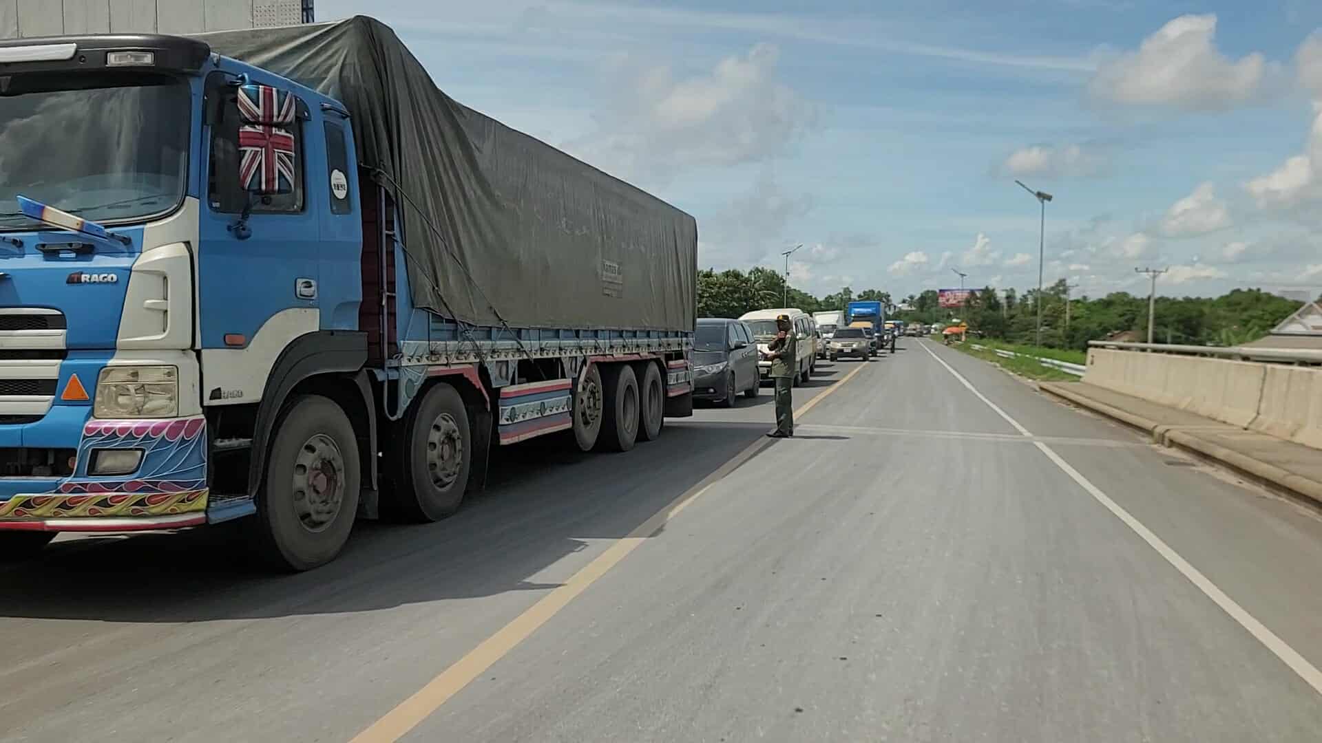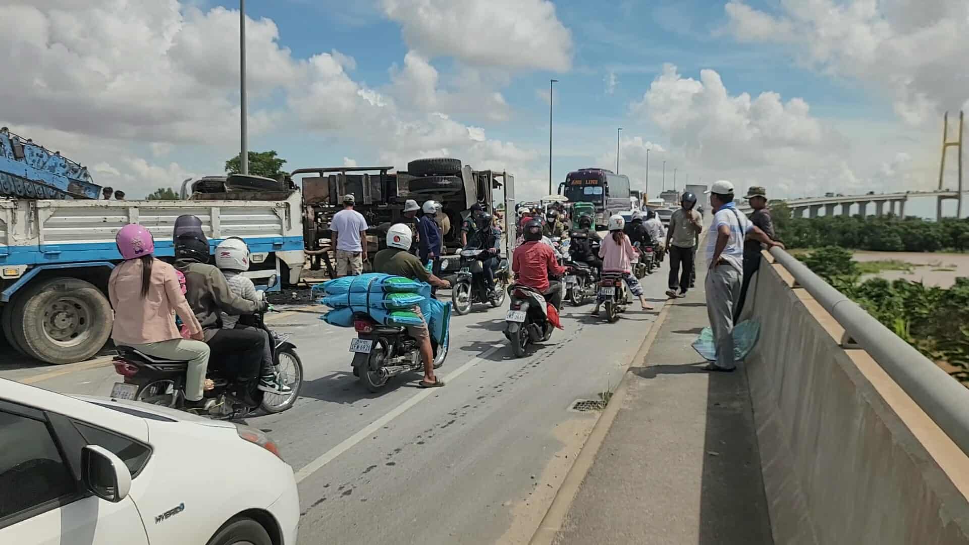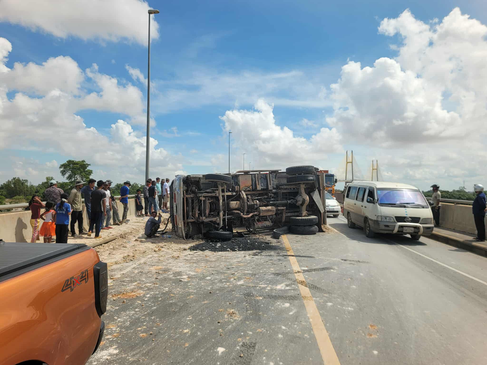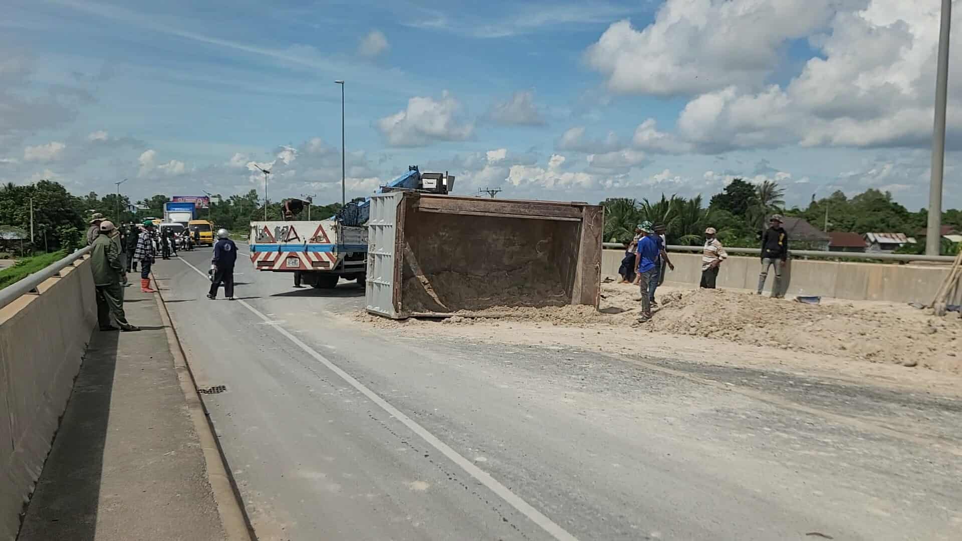 ឡានបែនដឹកដី ដឹកធ្ងន់ពេកផ្ទុះបែកកង់ក្រឡាប់ធ្វើឱ្យស្ទះចរាចរណ៍លើស្ពានរាប់ម៉ោង