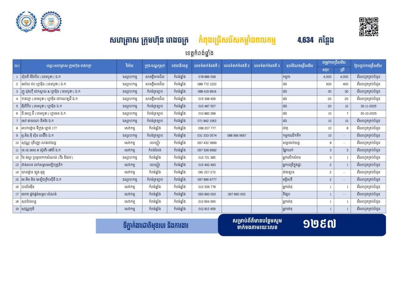 ក្នុងសេចក្តីជូនដំណឹងដដែល ក៏បានដាក់លេខទូរសព្ទទំនាក់ទំនងតាមទីកន្លែងនីមួយៗ ចំពោះព័ត៌មានលម្អិតសម្រាប់ទំនាក់ទំនងរកការងារធ្វើ គឺលេខ១២៩៧ ។