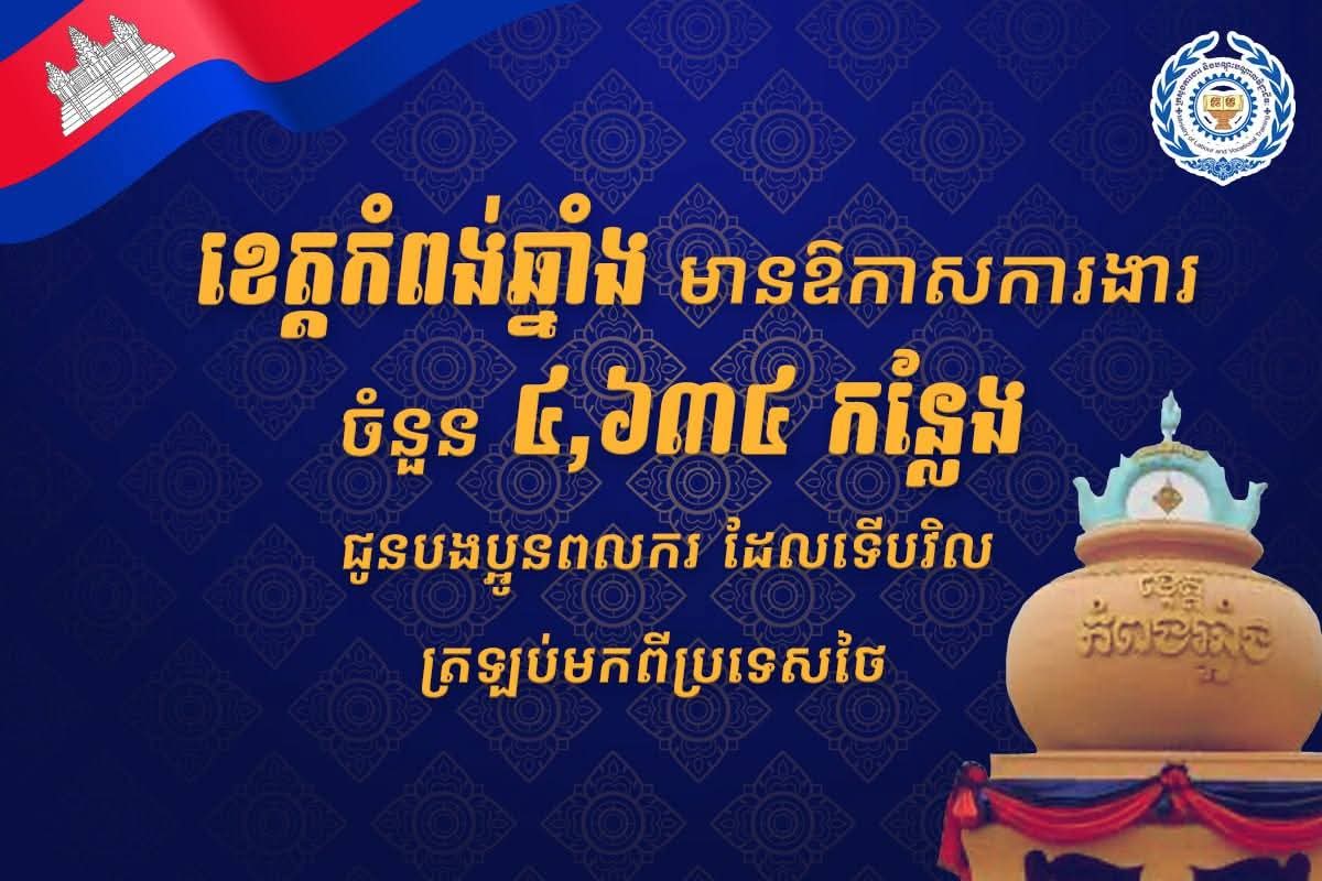 ខេត្តកំពង់ឆ្នាំង ៖ យោងតាមផេកផ្លូវការរបស់មន្ទីរការងារ និងបណ្ដុះបណ្ដាលវិជ្ជាជីវៈខេត្តកំពង់ឆ្នាំង នៅរសៀលថ្ងៃទី៤ ខែតុលា ឆ្នាំ២០២៥ នេះ បានប្រកាសជូនដំណឹងដល់បងប្អូនពលករដែលទើបវិលត្រឡប់មកពីប្រទេសថៃ ក៏ដូចជាបងប្អូនដែលមិនទាន់មានការងារធ្វើ ហើយកំពុងស្វះស្វែងរកការងារធ្វើឲ្យបានជ្រាបថា ដោយសារពេលនេះខេត្តកំពង់ឆ្នាំងមានតម្រូវការផ្តល់ឱកាសការងារចំនួនដល់ទៅ៤ ៦៣៤កន្លែង ដែលជាដំណឹងល្អបំផុតសម្រាប់បងប្អូនដែលមិនទាន់មានការងារធ្វើ ។