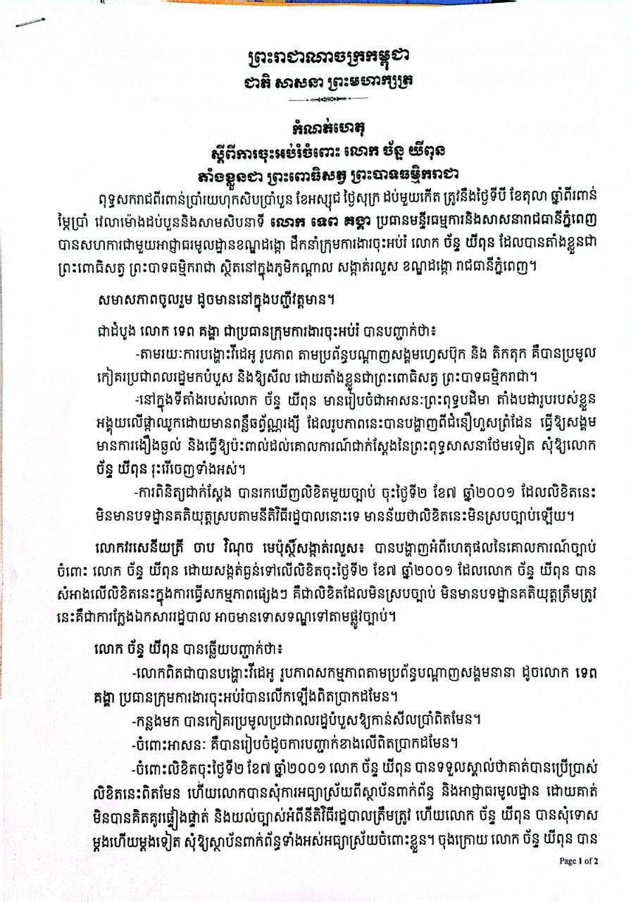 យោងតាមការចុះផ្សាយរបស់ក្រសួងធម្មការនិងសាសនា នៅថ្ងៃទី០៤ ខែតុលានេះ បានឱ្យដឹងថា កាលពីម្សិលមិញ លោក ទេព គង្គា ប្រធានមន្ទីរធម្មការនិងសាសនារាជធានីភ្នំពេញ បានសហការជាមួយអាជ្ញាធរមូលដ្ឋានខណ្ឌដង្កោ ដឹកនាំក្រុមការងារចុះអប់រំណែនាំចំពោះ លោក ច័ន្ទ យីពុន ដែលតាំងខ្លួនជា ព្រះពោធិសត្វ ព្រះបាទធម្មិករាជា ស្ថិតនៅភូមិកណ្ដាល សង្កាត់រលួស ខណ្ឌដង្កោ រាជធានីភ្នំពេញ ដែលកន្លងមកបានបង្ហោះរូបថត និងវីដេអូសកម្មភាពលើបណ្ដាញសង្គម ដើម្បីកៀរគរប្រជាពលរដ្ឋឲ្យមកទទួលការបំបួសនិងសមាទាននិច្ចសីល (សីល៥)ពីខ្លួន តាំងរូបថតអង្គុយលើផ្កាឈូកមានឆព្វណ្ណរង្សី រៀបចំអាសនៈព្រះពុទ្ធរូបក្នុងផ្ទះខុសពីគោលការណ៍ពុទ្ធសាសនា ធ្វើឱ្យសង្គមមានការងឿងឆ្ងល់ និងប៉ះពាល់ដល់តម្លៃព្រះពុទ្ធសាសនាដែលជាសានារបស់រដ្ឋ។