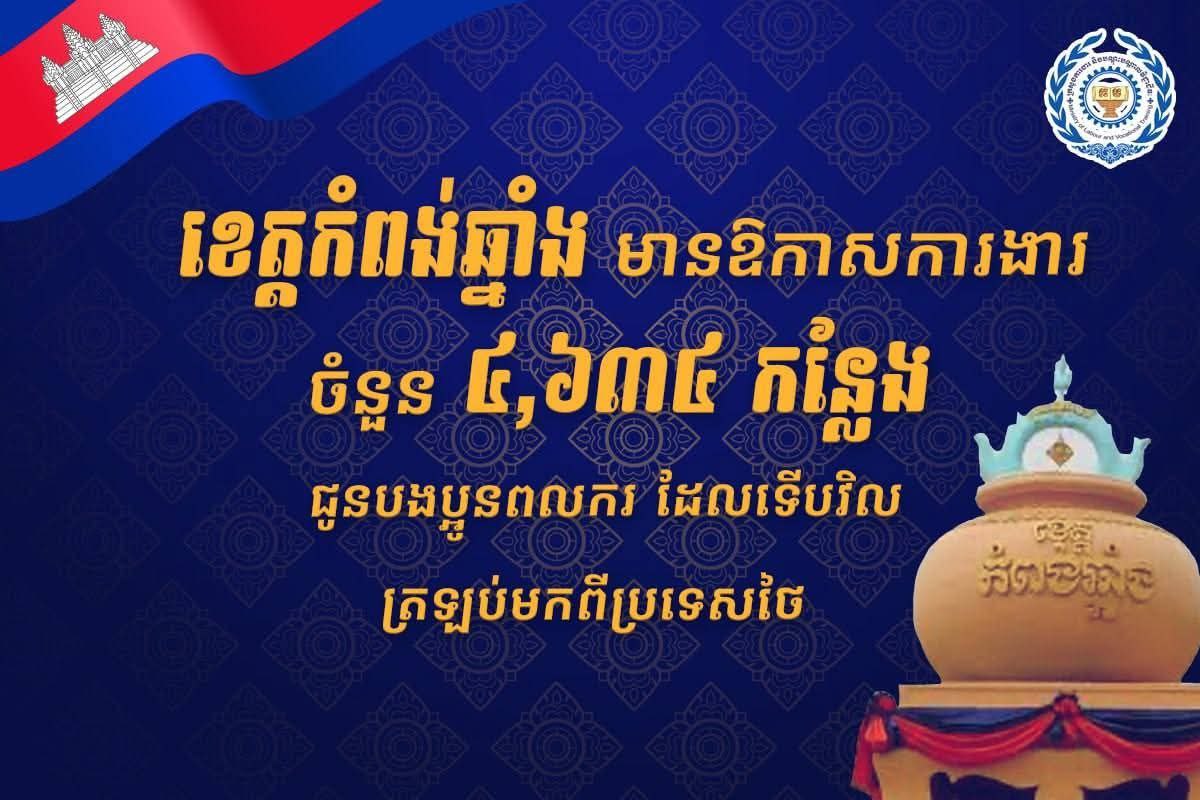 ឱកាសការងារនៅខេត្តកំពង់ឆ្នាំងមានជាង៤ពាន់កន្លែង ជាដំណឹងល្អសម្រាប់បងប្អូនពលករវិលមកពីថៃ និងអ្នកត្រូវការការងារធ្វើ