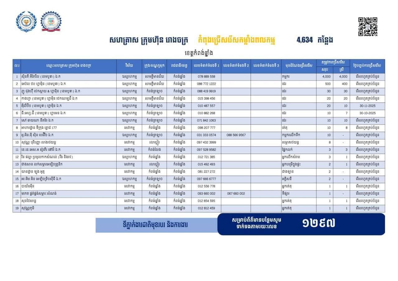 ខេត្តកំពង់ឆ្នាំង ៖ យោងតាមផេកផ្លូវការរបស់មន្ទីរការងារនិងបណ្ដុះបណ្ដាលវិជ្ជាជីវៈខេត្តកំពង់ឆ្នាំងនៅរសៀលថ្ងៃទី៤ខែតុលា ឆ្នាំ ២០២៥ នេះ បានប្រកាសជូនដំណឹងដល់បងប្អូនពលករដែលទើបវិលត្រឡប់មកពីប្រទេសថៃក៏ដូចជាបងប្អូនដែលមិនទាន់មានការងារធ្វើហើយកំពុងស្វះសែងរកការងារធ្វើ ឲ្យបានជ្រាបថា ដោយសារពេលនេះខេត្តកំពង់ឆ្នាំងមានតម្រូវការផ្តល់ឱកាសការងារចំនួនដល់ទៅ ៤…
