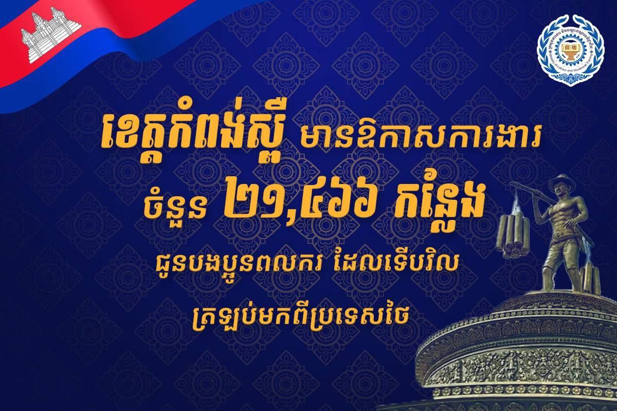 ឱកាសការងារជាង២ម៉ឺនកន្លែងនៅខេត្តកំពង់ស្ពឺ សម្រាប់បងប្អូនពលករដែលវិលមកពីថៃ