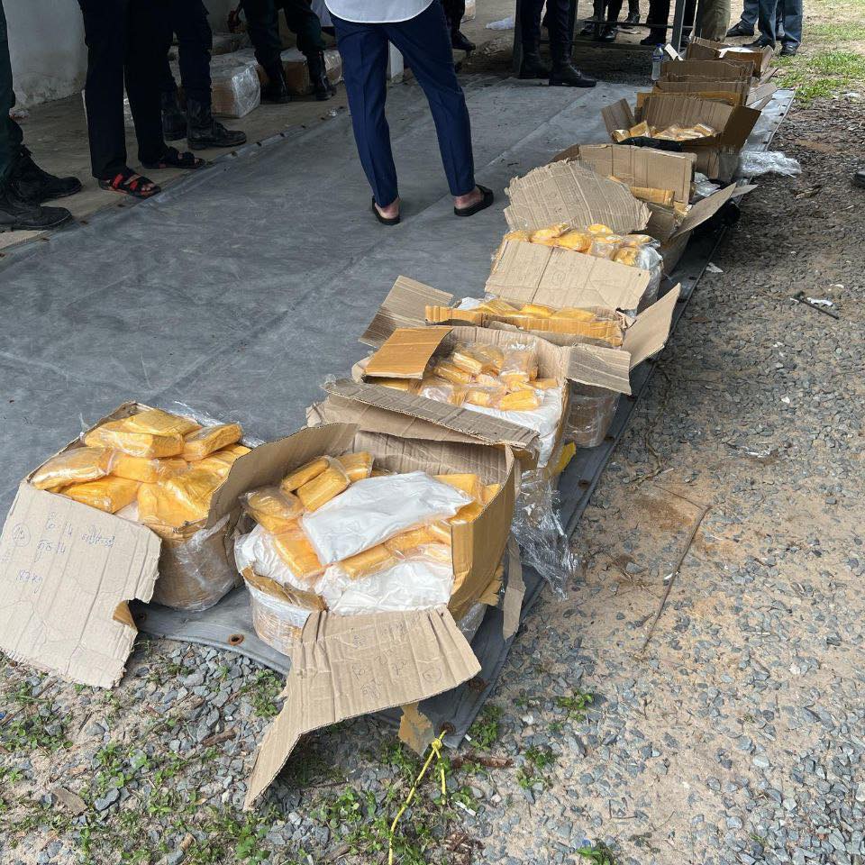 តាមការត្រួតពិនិត្យជាក់ស្តែង ឃើញមាន៖ ១-សង្ស័យជាកញ្ឆាក្រៀមចំនួន១២៤កញ្ចប់ (ធំ១២២កញ្ចប់ តូច២កញ្ចប់) ស្មើនឹង៦១,២០គីឡូក្រាម ។ ២-ម្សៅក្រាមពណ៌ស ចំនួន៤១០កញ្ចប់ធំ ស្មើនឹង៤១០គីឡូក្រាម ។ ៣-ម្សៅក្រាមពណ៌លឿង ចំនួន៤៤៩កញ្ចប់ (កញ្ចប់ធំ៤២ កញ្ចប់តូច៤០៧) ស្មើនឹង៦០,៣០គីឡូក្រាម ។ ៤-ម្សៅក្រាមពណ៌ផ្កាឈូក ចំនួន២២កញ្ចប់ធំ ស្មើនឹង២២គីឡូក្រាម ។ ៥-ម្សៅក្រាមពណ៌បៃតងស្រាល ចំនួន៦កញ្ចប់ធំ ស្មើនឹង៦គីឡូក្រាម ។