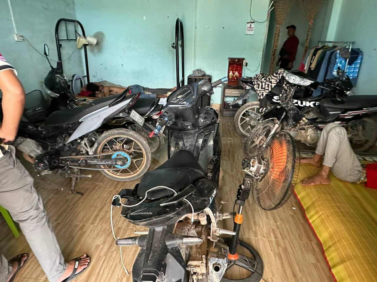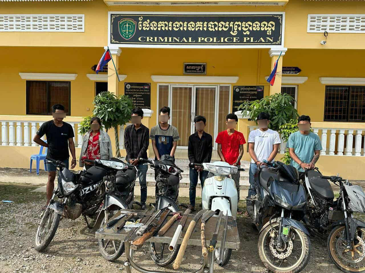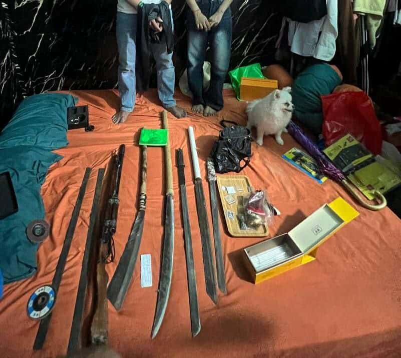 ក្រោយពីធ្វើការឃាត់ខ្លួនជនសង្ស័យរួច ហើយបានឆែកឆេររកឃើញមានក្រាមព៌ណ.សថ្លា និងម្សៅព៌ណ.ស សង្ស័័យថ្នាំញៀនចំនួន០៨កញ្ចប់ ថ្នាំគ្រាប់ព៌ណលឿង សង្ស័យថ្នាំញៀនចំនួន៤២គ្រាប់, ដាវច្នៃចំនួន៤ដើម, កាំបិតផ្គាក់១ដើម, កណ្ដៀវ១ដើម, កាំភ្លើងស្នប់បាញ់ខនយល់១ដើម, ដែកថែប២ដើម(ត្រៀមកែច្នៃធ្វើដាវ) ជំពាមកៅស៊ូ១ និងគ្រាប់ឃ្លីដែក មួយចំនួនដែកឆាប១ដើម, កាំបិតចិតបន្លែ២ដើម, ពូថៅ១ និងញញួរ១, ម៉ូតូចំនួន៦គ្រឿង និងសម្ភារដែលពាក់ព័ន្ធមួយចំនួនទៀត។
