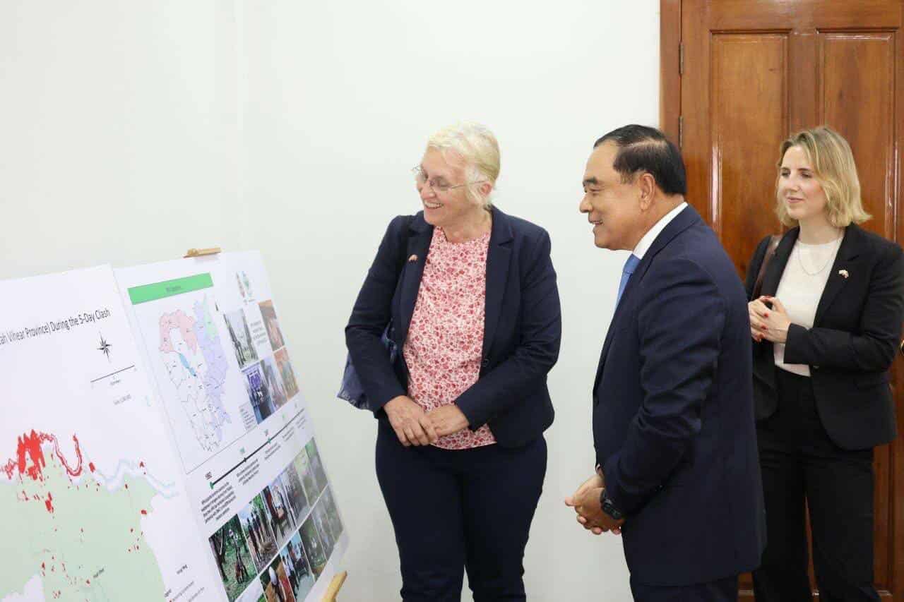 ឯកឧត្តម លី ធុជ បញ្ជាក់ទៀតថា ពាក់ព័ន្ធនឹងបញ្ហាព្រំដែនកម្ពុជា-ថៃ សម្តេចធិបតីចង់ឱ្យតំបន់ព្រំដែនក្លាយជាតំបន់សន្តិភាព។ លោកជំទាវ Astrid Emilie Helle បានថ្លែងអំណរគុណចំពោះភាពជាដៃគូ និងកិច្ចសហប្រតិបត្តិការជាមួយរាជរដ្ឋាភិបាលកម្ពុជា និងបានកោតសរសើរចំពោះសមិទ្ធផលសម្រេចបានក្នុងវិស័យសកម្មភាពមីននៅកម្ពុជា ក៏ដូចជាភាពជោគជ័យក្នុងភាពជាប្រធាន និងម្ចាស់ផ្ទះរៀបចំកិច្ចប្រជុំកំពូលសៀមរាប-អង្គរស្តីពីពិភពលោកមួយដែលគ្មានមីននៃអនុសញ្ញាអូតាវ៉ាឆ្នាំ២០២៤ ។