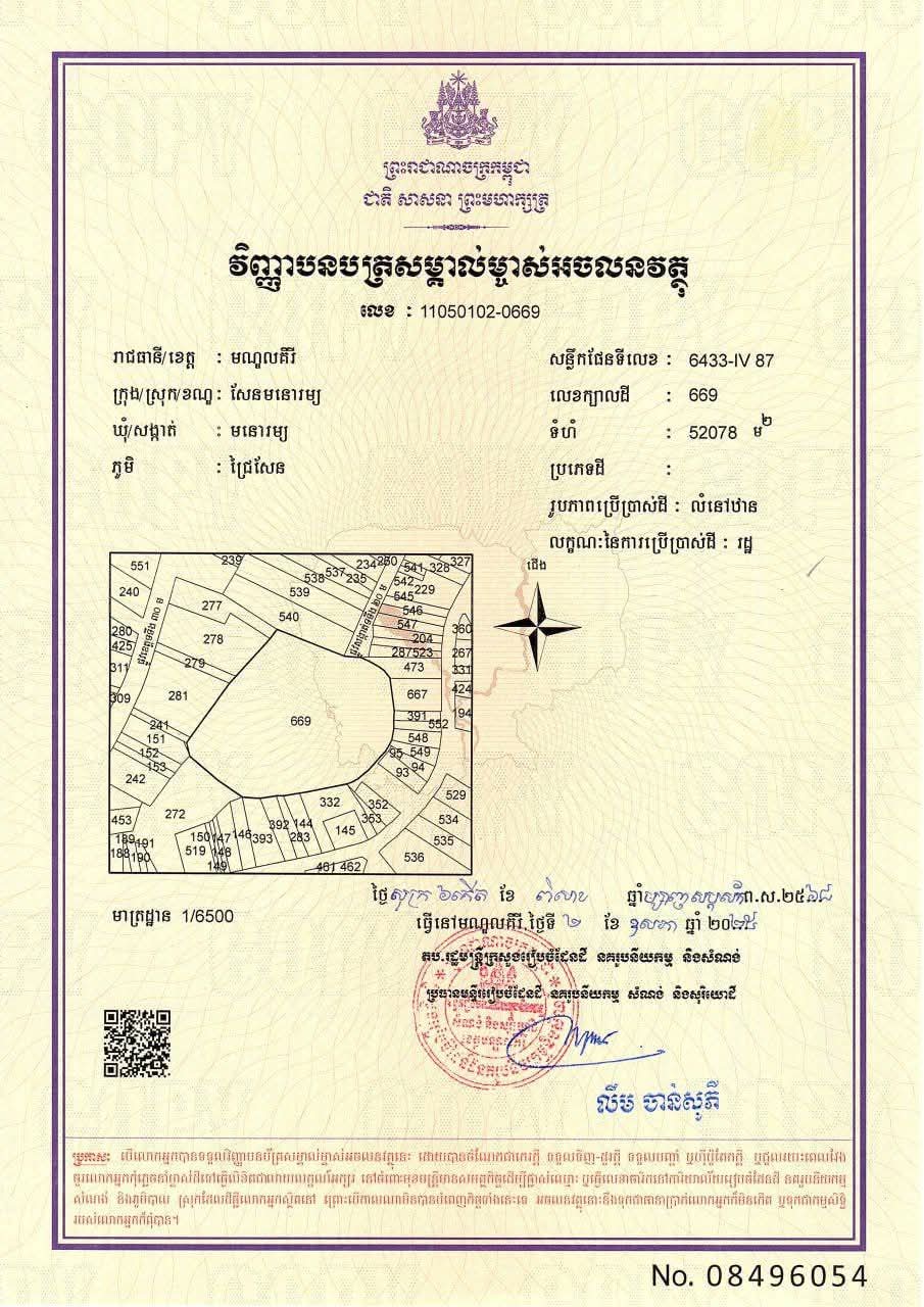 លោក លឹម ចាន់សូភី ប្រធានមន្ទីររៀបចំដែនដីនគរូបនីយកម្ម សំណង់ និងសុរិយោដី ខេត្តបានឲ្យដឹង កាលពីព្រឹកថ្ងៃទី៦ ខែតុលា ឆ្នាំ២០២៥ ថា នៅទូទាំងខេត្តមណ្ឌលគិរី មានដីព្រះរាជទ្រព្យតែមួយកន្លែងប៉ុណ្ណោះ ដែលមានទំហំ៥២០៧៨ម៉ែត្រការ៉េ ឬស្មើនិងជាងប្រាំហិចតា ស្ថិតនៅភូមិជ្រៃសែន សង្កាត់មនោរម្យ ក្រុងសែនមនោរម្យ ដើម្បីប្រគល់ជូនក្រសួងព្រះព្រះបរមរាជវាំង ។