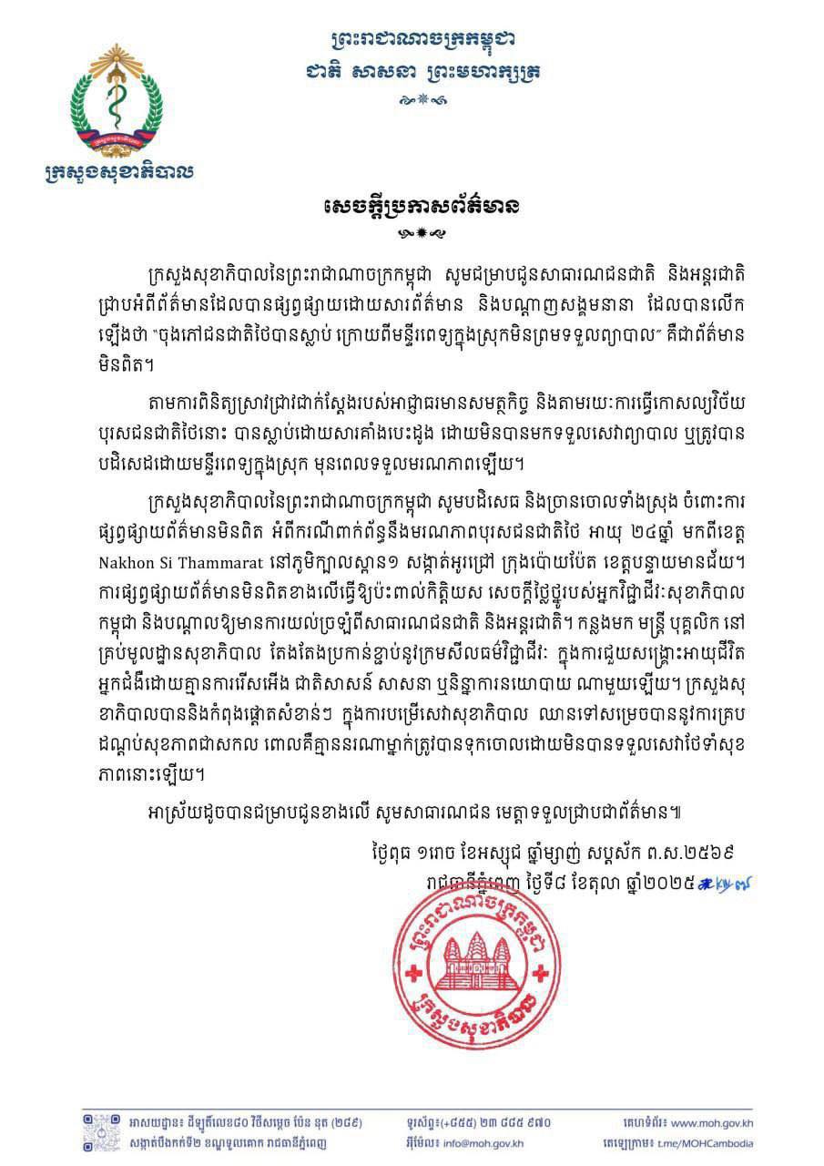 យោងតាមសេចក្តីប្រកាសព័ត៌មានរបស់ក្រសួងសុខាភិបាលនៃព្រះរាជាណាចក្រកម្ពុជា នៅថ្ងៃទី៩ ខែតុលា ឆ្នាំ២០២៥ បានលើកឡើងថា សូមជម្រាបជូនសាធារណជនជាតិ និងអន្តរជាតិ ជ្រាបអំពីព័ត៌មានដែលបានផ្សព្វផ្សាយដោយសារព័ត៌មាន និងបណ្តាញសង្គមនានាដែលបានលើកឡើងថា «ចុងភៅជនជាតិថៃបានស្លា.ប់ ក្រោយពីមន្ទីរពេទ្យក្នុងស្រុកមិនព្រមទទួលព្យាបាល» គឺជាព័ត៌មានមិនពិត ។