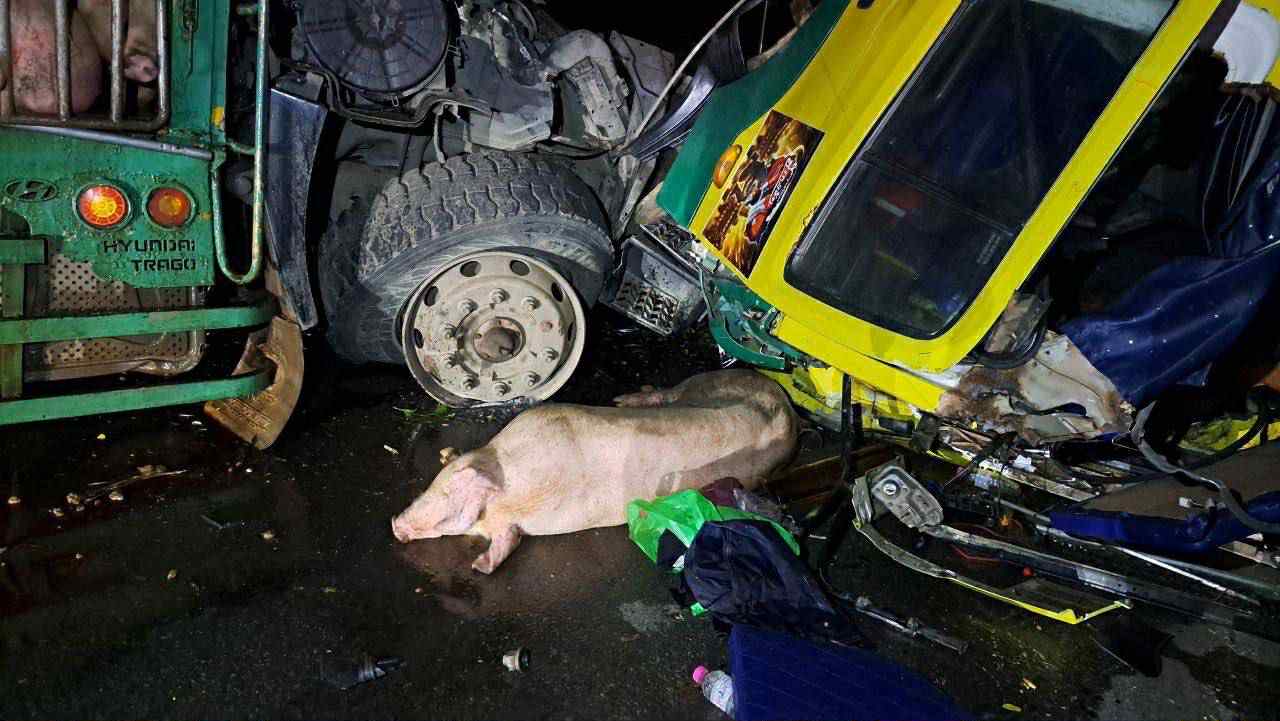 បើពិនិត្យរូបភាពក្នុងកាមេរ៉ាសុវត្ថិភាព គេឃើញរថភ្លើងបានបើកស្ទើរផុតទៅហើយ ស្រាប់តែរថយន្តដឹកជ្រូកបើកស្លុយដោយមិនបានបន្ថយល្បឿនបន្តិចឡើយទៅបុកទូរថភ្លើងទាំងកំរោលពេញទំហឹងតែម្ដង ។ នៅកន្លែងកើតហេតុ គេឃើញក្បាលរថយន្តកំពិតរួញ រីឯកាប៊ីនរថយន្តរបើកធ្លាក់ចេញពីទូរថយន្តខ្ទាតធ្លាក់ទៅលើចិញ្ចើមថ្នល់ ខណៈមនុស្សចំនួន០៤នាក់ មានតៃកុង និងអ្នករួមដំណើរបានរងរបួសធ្ងន់ និងស្រាល ។