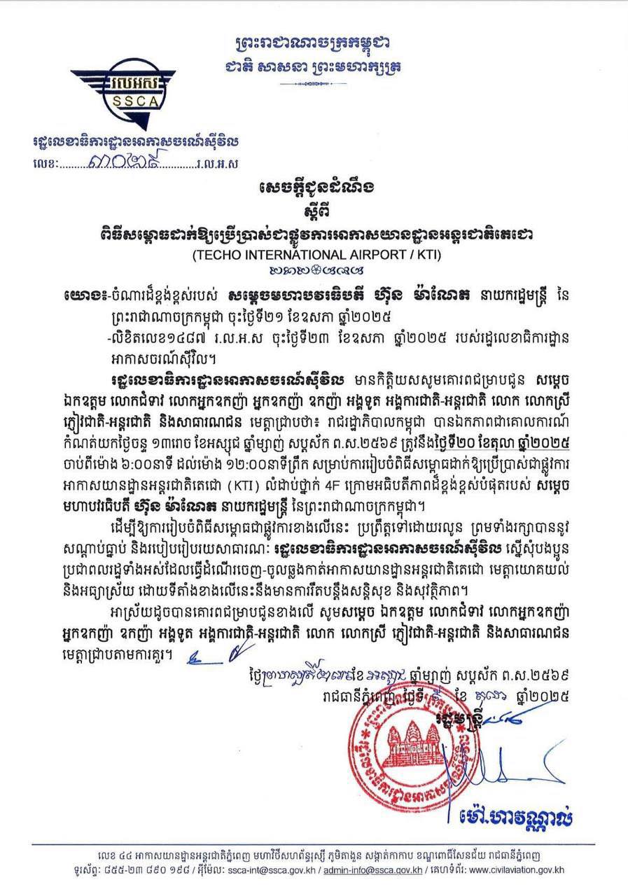 អាកាសយានដ្ឋានអន្តរជាតិតេជោ (KTI) នឹងត្រូវសម្ពោធដាក់ឱ្យប្រើប្រាស់ជាផ្លូវការនៅព្រឹកថ្ងៃទី២០ តុលា ២០២៥