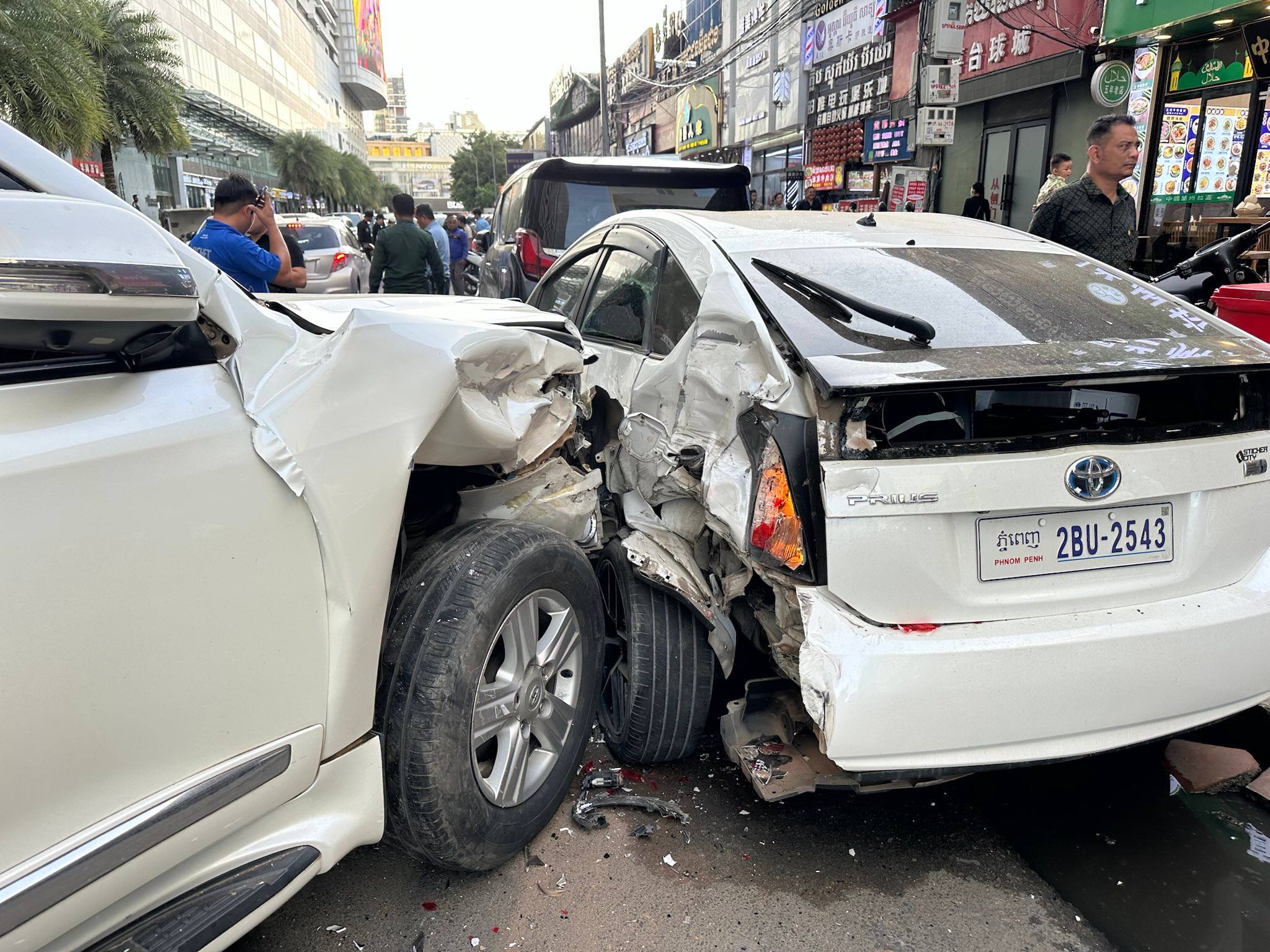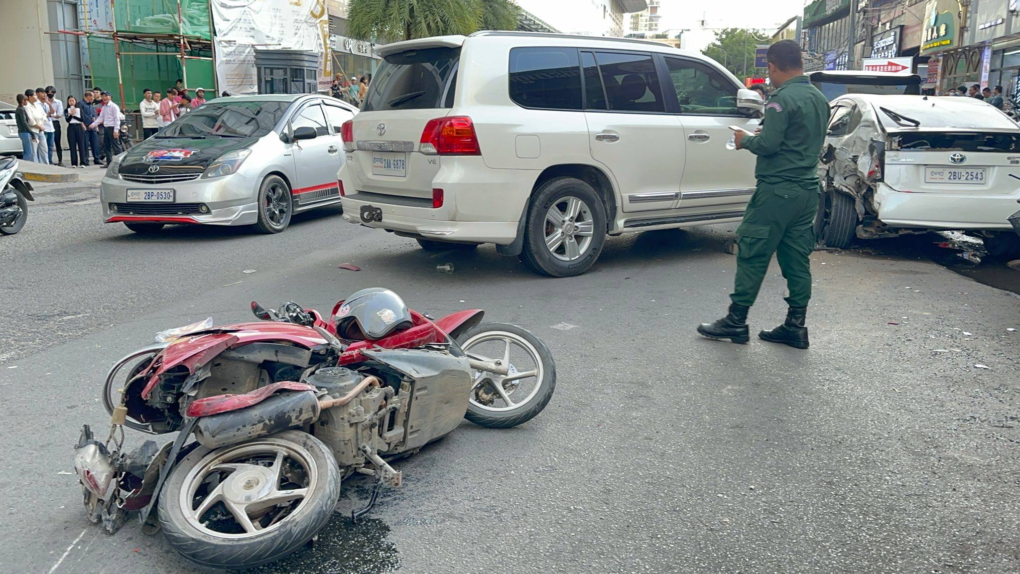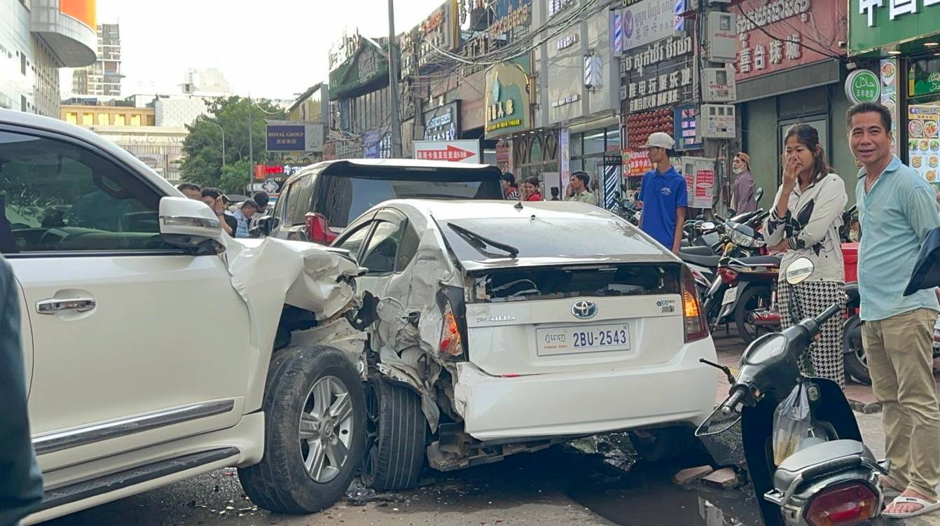 រាជធានីភ្នំពេញ ៖ បុរសម្នាក់សង្ស័យស្រវឹងស្រា បានបើករថយន្តលឿនដូចហោះ រេចង្កូត ជ្រុលទៅបុករះម៉ូតូ២គ្រឿង និងរថយន្ត៣គ្រឿង រួមទាំងរ៉ឺម៉ក់ ១គ្រឿងទៀត បណ្ដាលអោយមនុស្សប្រុសស្រី ៣នាក់ របួសធ្ងន់ស្រាល ត្រូវបានបញ្ជូនទៅសង្គ្រោះនៅមន្ទីរពេទ្យ ។