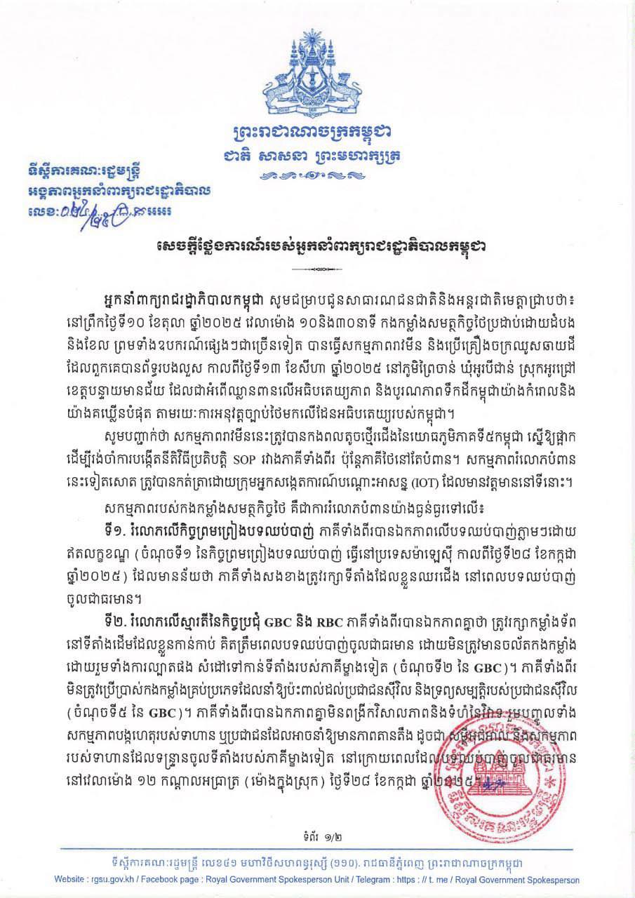 អ្នកនាំពាក្យរាជរដ្ឋាភិបាលកម្ពុជា សូមបញ្ជាក់សារជាថ្មីម្ដងទៀតថា រាជរដ្ឋាភិបាលកម្ពុជាដឹកនាំដោយ សម្តេចមហាបរធិបតី ហ៊ុន ម៉ាណែត នាយករដ្ឋមន្ត្រី នៃព្រះរាជាណាចក្រកម្ពុជា ប្រកាន់ខ្ជាប់គោលជំហរច្បាស់លាស់ ក្នុងការគោរពនិងអនុវត្តកិច្ចព្រមព្រៀងបទឈប់បាញ់ និងដោះស្រាយបញ្ហាព្រំដែនដោយសន្តិវិធីឈរលើមូលដ្ឋាន នៃកិច្ចព្រមព្រៀងទ្វេភាគីដែលមានស្រាប់ ព្រមទាំងអនុសញ្ញា សន្ធិសញ្ញា និងច្បាប់អន្តរជាតិជាធរមាន ៕