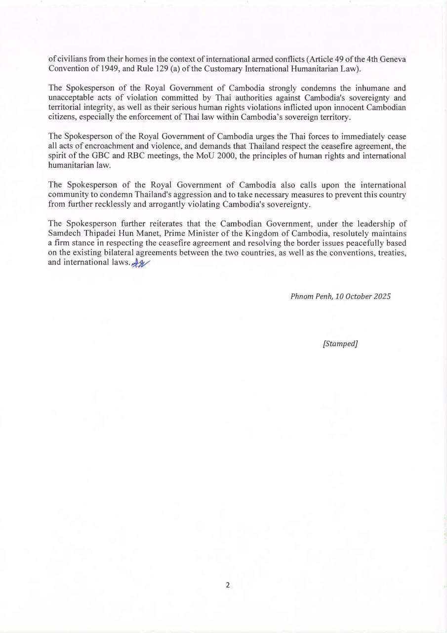 អ្នកនាំពាក្យរាជរដ្ឋាភិបាលកម្ពុជា សូមអំពាវនាវឱ្យអាជ្ញាធរថៃបញ្ឈប់ទង្វើរំលោភបំពាន និងអំពើហិង្សា ទាំងអស់នេះជាបន្ទាន់ និងទាមទារឱ្យភាគីថៃគោរពកិច្ចព្រមព្រៀងបទឈប់បាញ់ និងស្មារតីនៃកិច្ចប្រជុំ GBC និង RBC អនុស្សរណៈនៃការយោគយល់គ្នា (MoU) ឆ្នាំ២០០០ និងគោលការណ៍សិទ្ធិមនុស្ស ក៏ដូចជាច្បាប់ មនុស្សធម៌អន្តរជាតិជាធរមាន ។