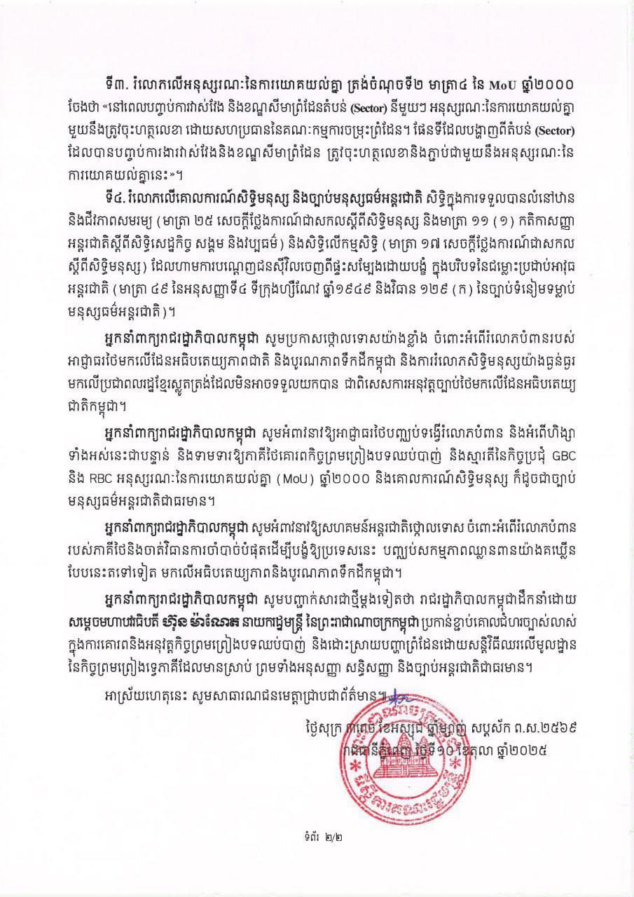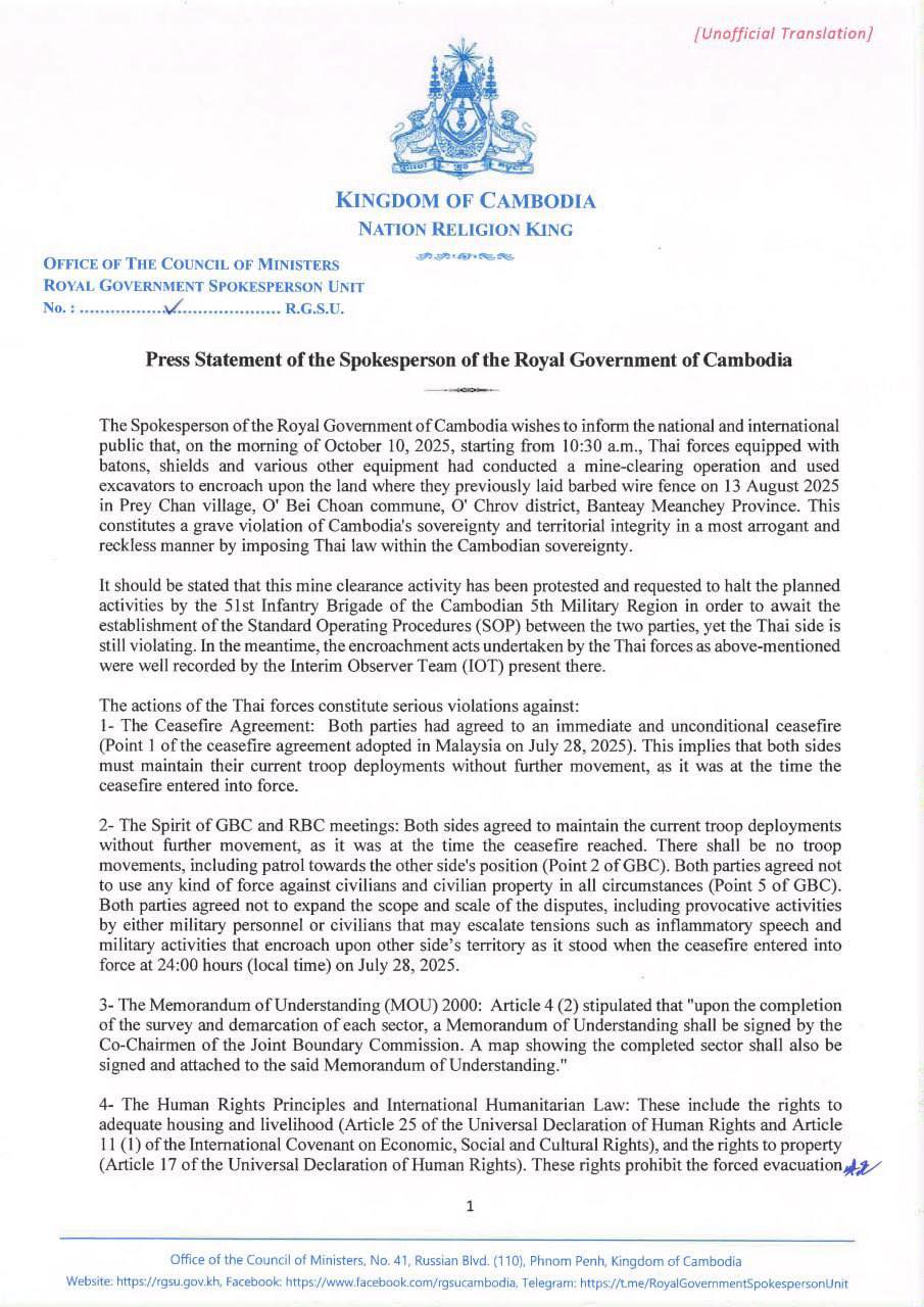 រាជធានីភ្នំពេញ ៖ សេចក្ដីថ្លែងការណ៍របស់អ្នកនាំពាក្យរាជរដ្ឋាភិបាលកម្ពុជា សូមជម្រាបជូនសាធារណជនជាតិ និងអន្តរជាតិ មេត្តាជ្រាបថា ៖ នៅព្រឹកថ្ងៃទី១០ ខែតុលា ឆ្នាំ២០២៥ វេលាម៉ោង១០និង៣០នាទី កងកម្លាំងសមត្ថកិច្ចថៃ ប្រដាប់ដោយដំបង និងខែល ព្រមទាំងឧបករណ៍ផ្សេងៗជាច្រើនទៀត បានធ្វើសកម្មភាពរាវមីន និងប្រើគ្រឿងចក្រឈូសឆាយដី ដែលពួកគេបានព័ទ្ធរបងលួស កាលពីថ្ងៃទី១៣ ខែសីហា ឆ្នាំ២០២៥ នៅភូមិព្រៃចាន់ ឃុំអូរបីជាន់ ស្រុកអូរជ្រៅ ខេត្តបន្ទាយមានជ័យ ដែលជាអំពើឈ្លានពានលើអធិបតេយ្យភាព និងបូរណភាពទឹកដីកម្ពុជាយ៉ាងកំរោល និងយ៉ាងគឃ្លីនបំផុត តាមរយៈការអនុវត្តច្បាប់ថៃ មកលើដែនអធិបតេយ្យរបស់កម្ពុជា ។