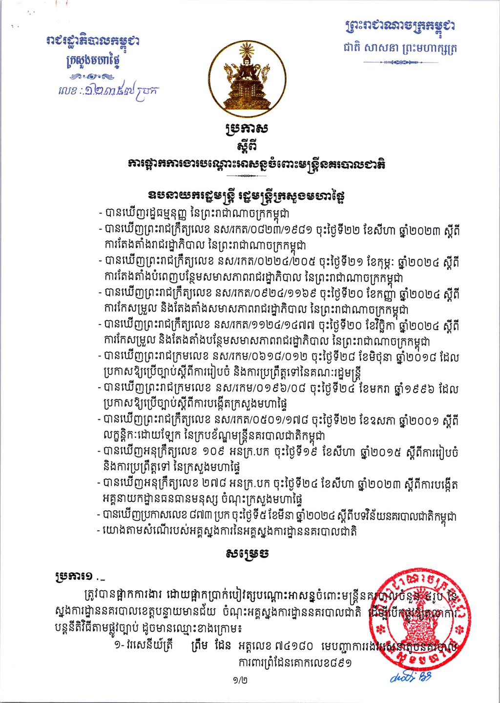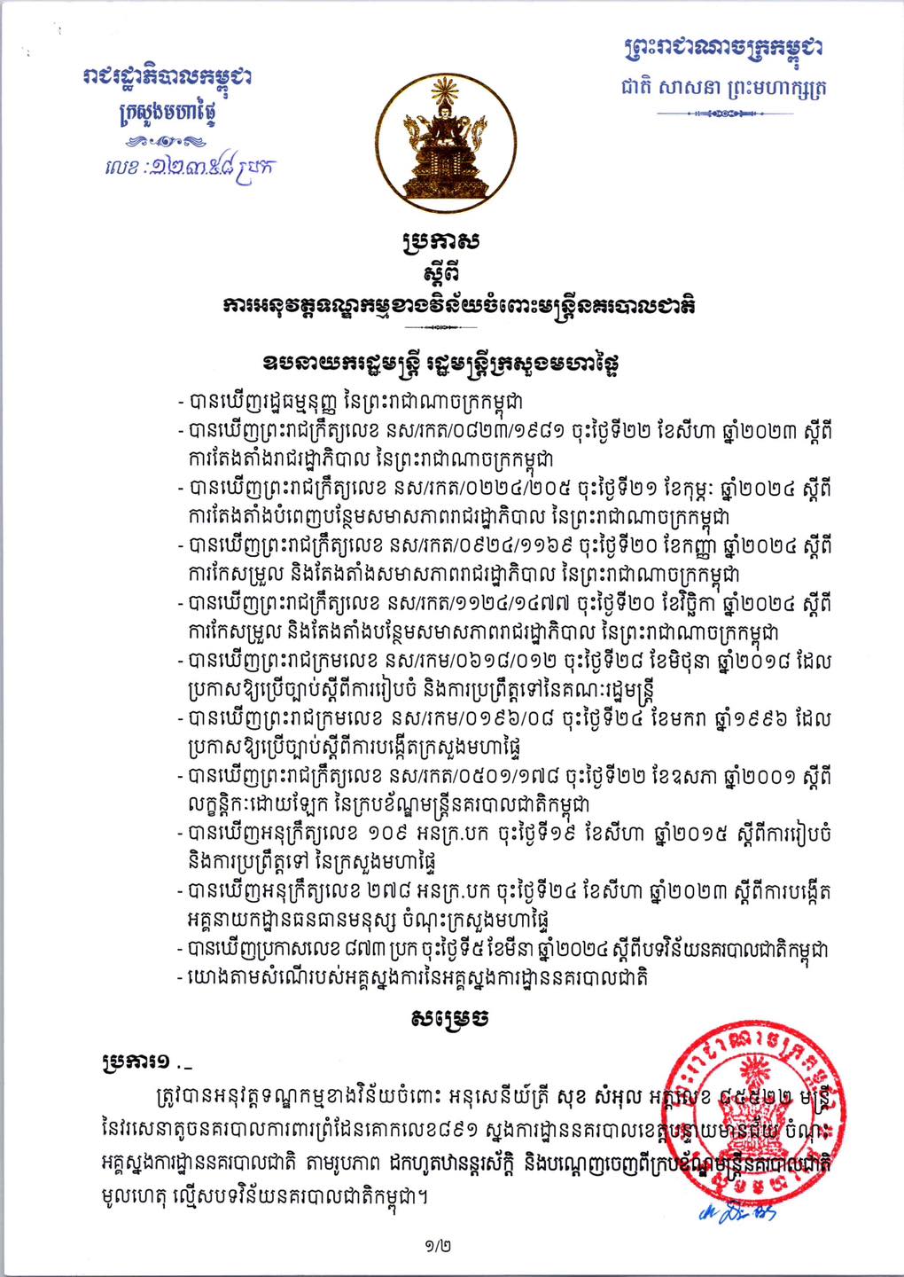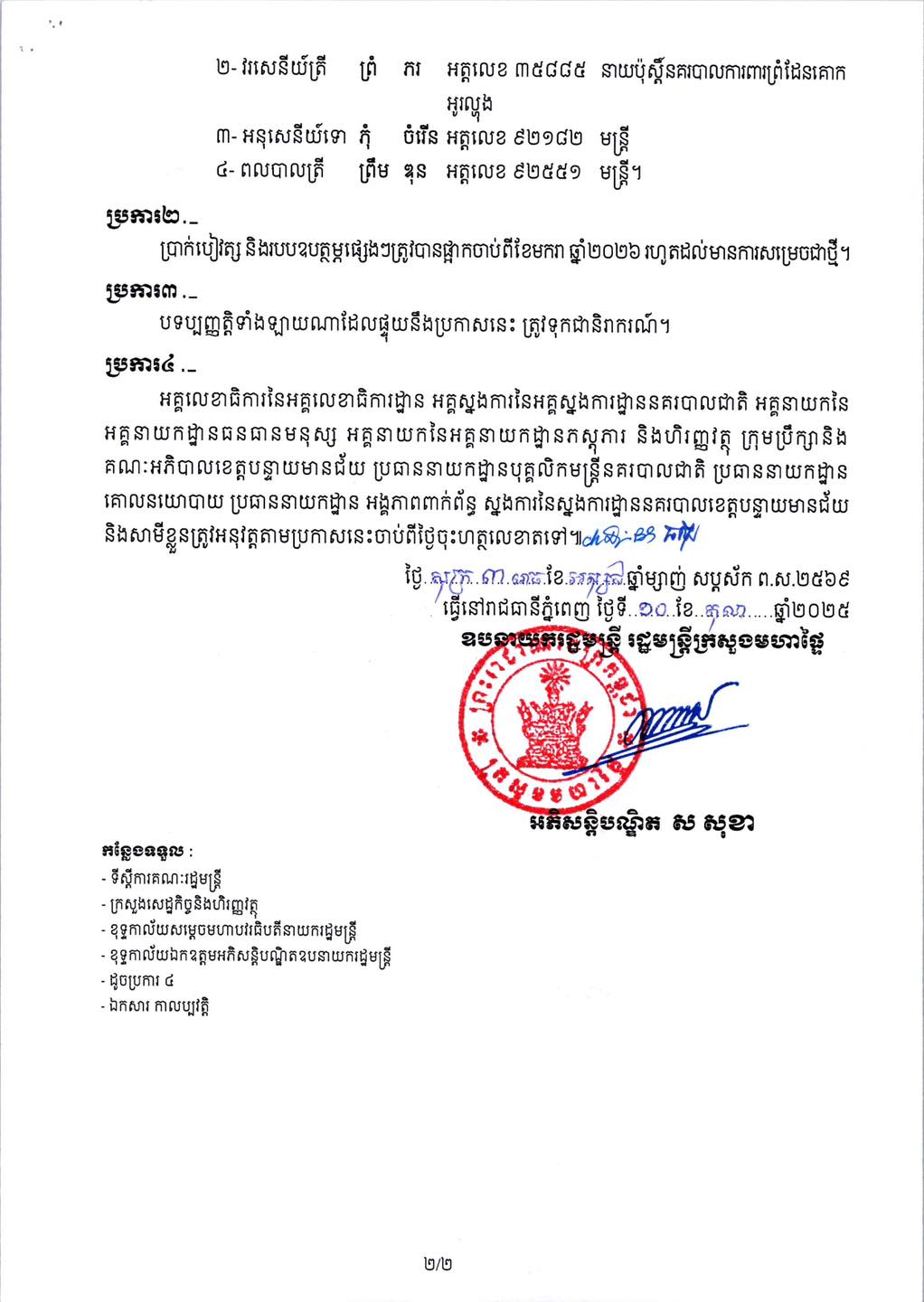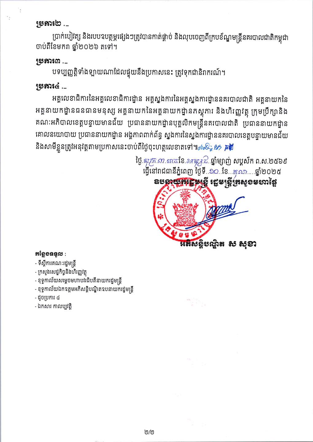 ឯកឧត្តមអភិសន្តិបណ្ឌិត ស សុខា ឧបនាយករដ្ឋមន្ត្រី រដ្ឋមន្ត្រីក្រសួងមហាផ្ទៃ នៅថ្ងៃទី១០ ខែតុលា ឆ្នាំ២០២៥នេះ បានសម្រេចដកហូតឋានន្តរស័ក្តិ និងបណ្តេញចេញពីក្របខ័ណ្ឌមន្ត្រីនគរបាលជាតិ ចំពោះអនុសេនីយ៍ត្រី សុខ សំអុល មន្ត្រីនៃវរសេនាតូចនគរបាលការពារព្រំដែនគោក លេខ៨៩១ ស្នងការដ្ឋាននគរបាលខេត្តបន្ទាយមានជ័យ ចំណុះអគ្គស្នងការដ្ឋាននគរបាលជាតិ ។